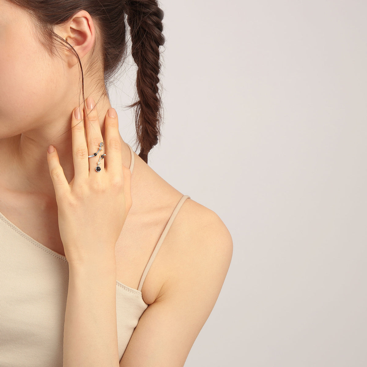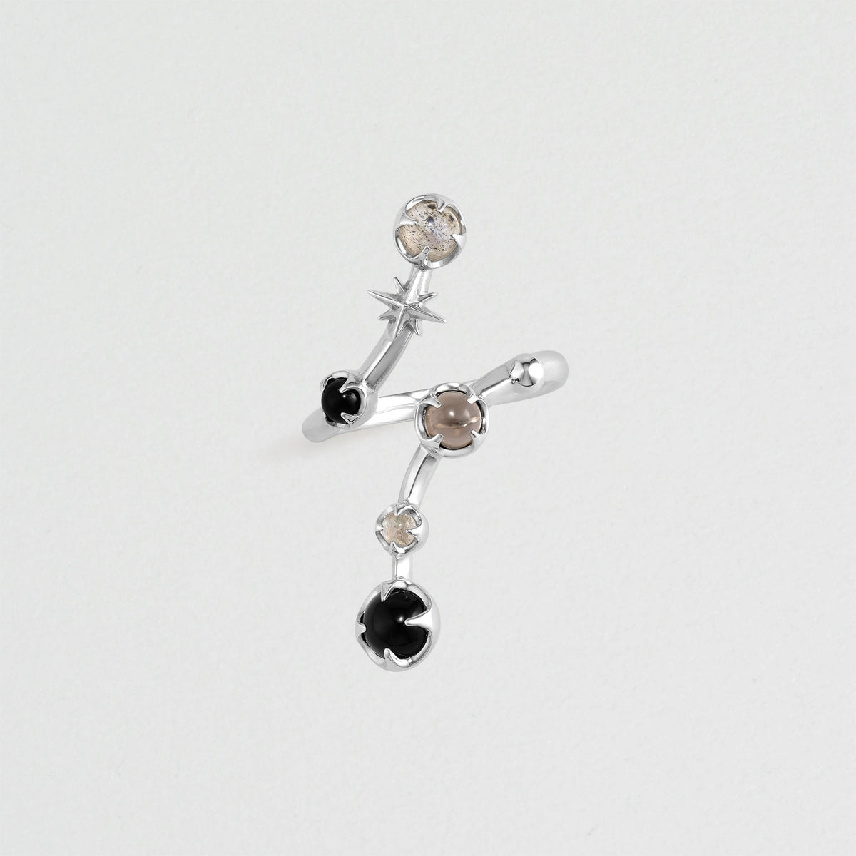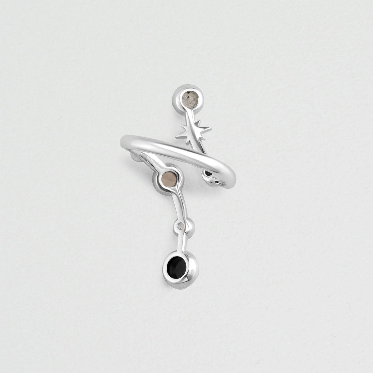 月の満ち欠けからインスパイアされた、神秘的なCosmic GEMリング。新月のミステリアスなムードを映し出す漆黒のブラックカルセドニー、ブルーシラーが奥行きを感じさせるラブラドライト、洗練されたブラウンがシックなスモーキークォーツ。それぞれの石の魅力が渾然一体となって、手元を幻想的に彩ります。宇宙に広がる星々への感動を美しいカラーストーンで表現したリングは、指にくるりと巻き付く大胆なフォルム。ストーンの合間にあしらわれた、幸運のオクタグラム(八芒星)モチーフもモダンなアクセントに。リングの持つ華やかなボリューム感が、コーディネートの主役として存在感を放ちます。