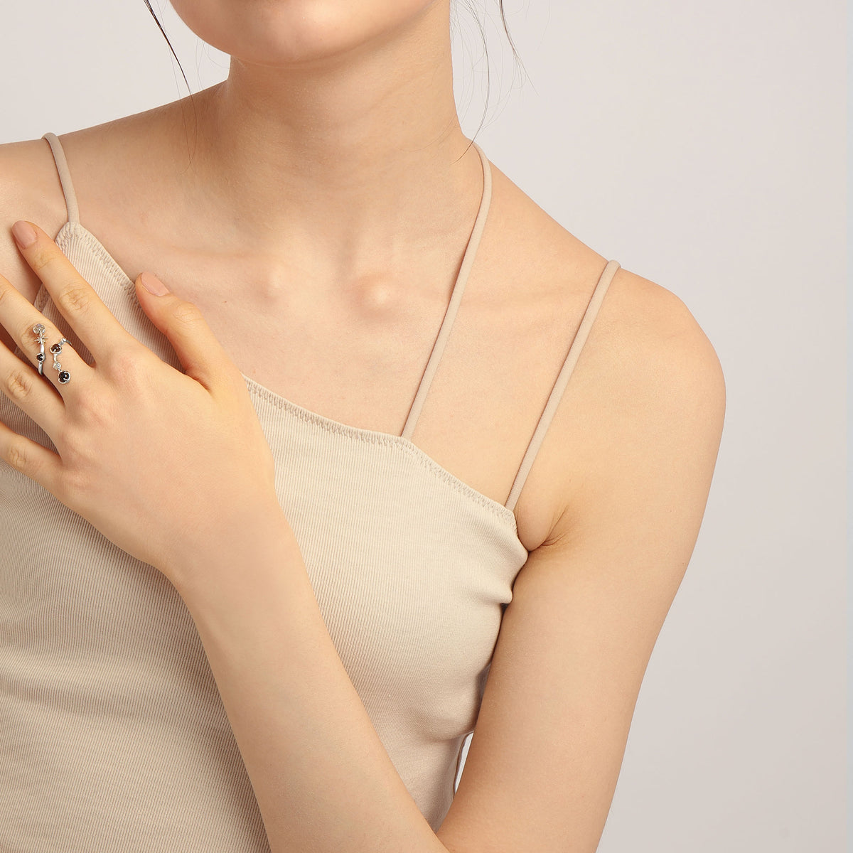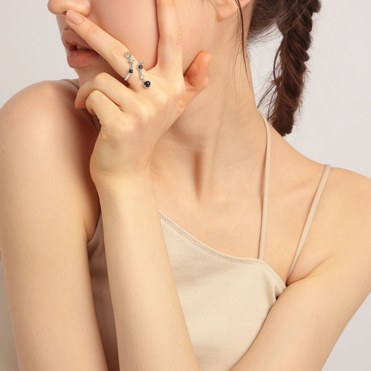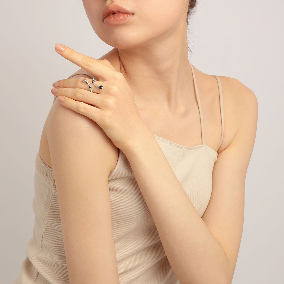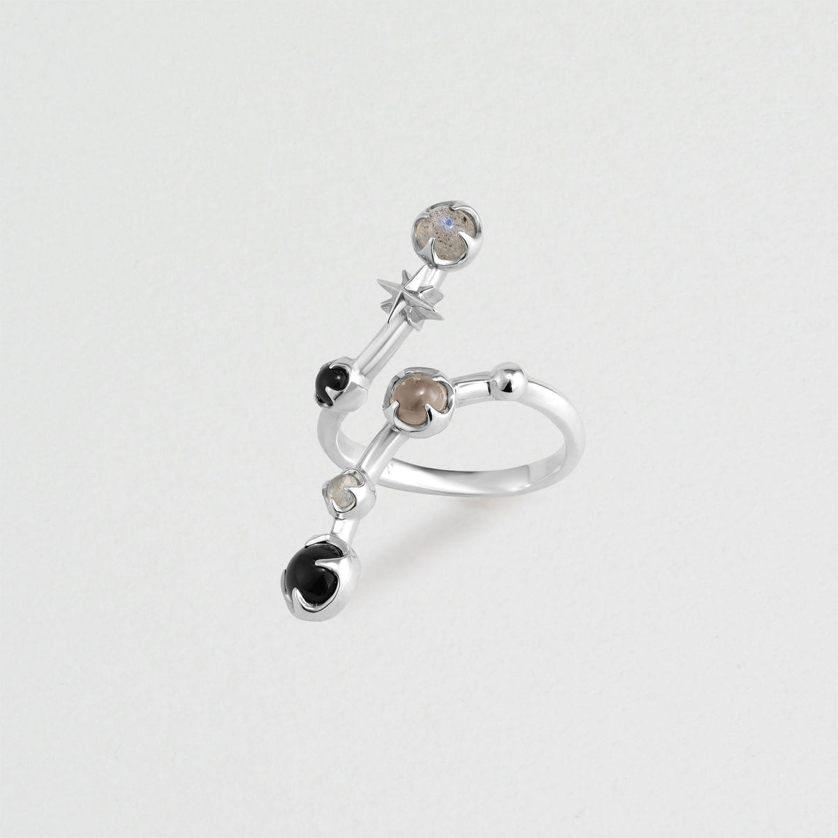 月の満ち欠けからインスパイアされた、神秘的なCosmic GEMリング。新月のミステリアスなムードを映し出す漆黒のブラックカルセドニー、ブルーシラーが奥行きを感じさせるラブラドライト、洗練されたブラウンがシックなスモーキークォーツ。それぞれの石の魅力が渾然一体となって、手元を幻想的に彩ります。宇宙に広がる星々への感動を美しいカラーストーンで表現したリングは、指にくるりと巻き付く大胆なフォルム。ストーンの合間にあしらわれた、幸運のオクタグラム(八芒星)モチーフもモダンなアクセントに。リングの持つ華やかなボリューム感が、コーディネートの主役として存在感を放ちます。