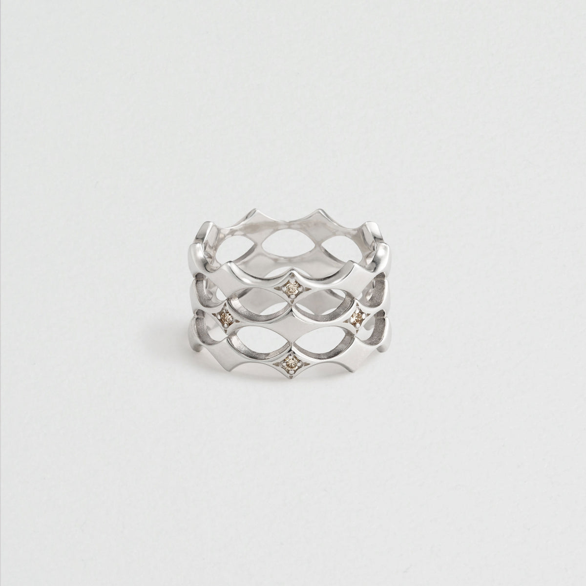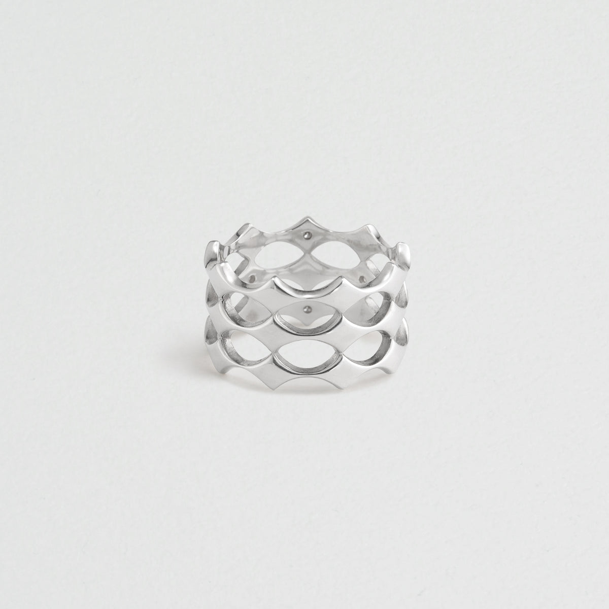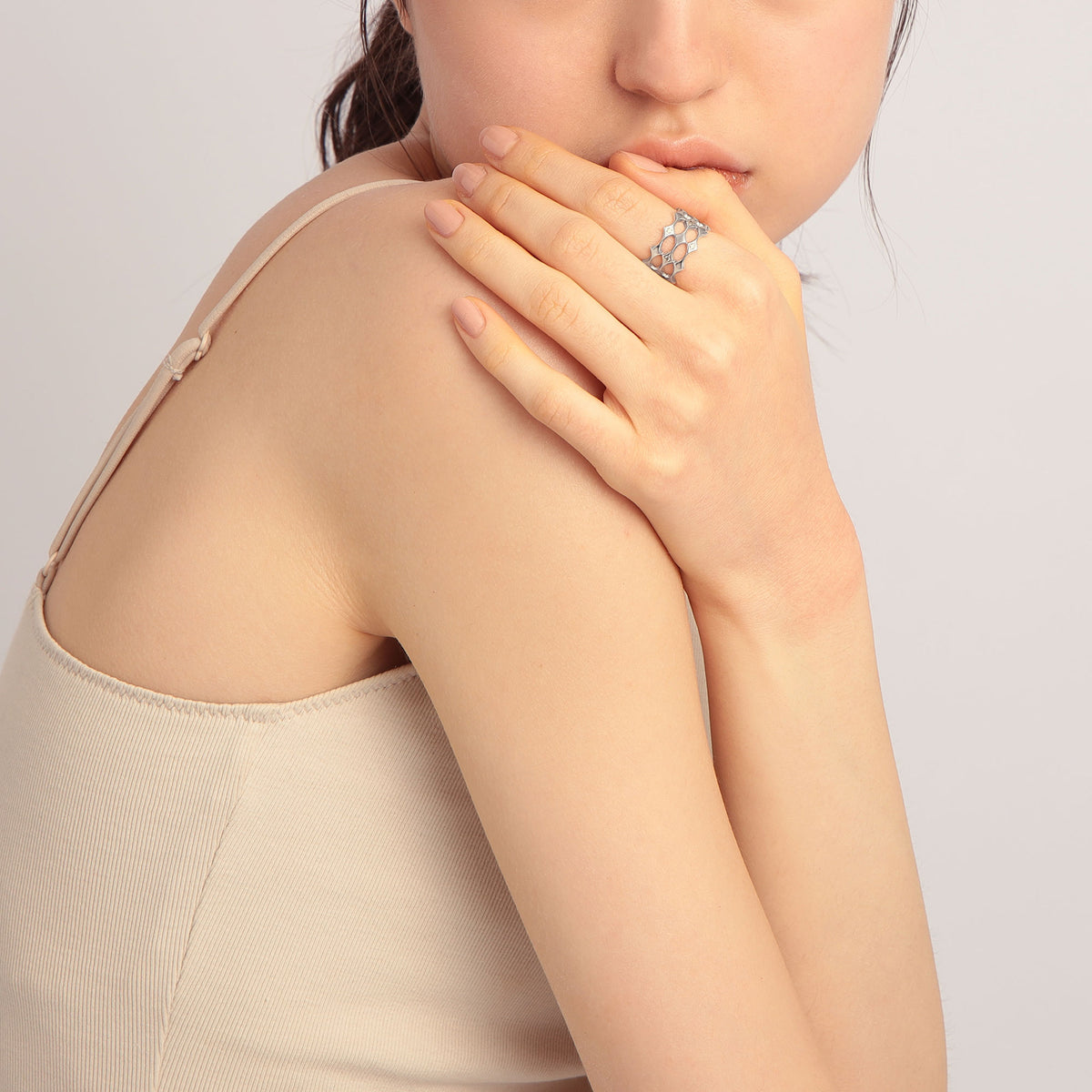 エナジェティックなしし座の季節をイメージした、光り輝くクラルスシルエットの3連リング。連なったアームに配された4石のダイヤモンドが生み出す、菱形シルエットのリズムが地金のシェイプを一層引き立てます。デイリースタイルからオケージョンまで、日々のコーディネートにプレシャスな輝きをそえてくれる計算されたボリューム感と、ダイヤモンドの揺るぎない輝きが、身にまとう人のパーソナリティと呼応するように存在感を放ちます。