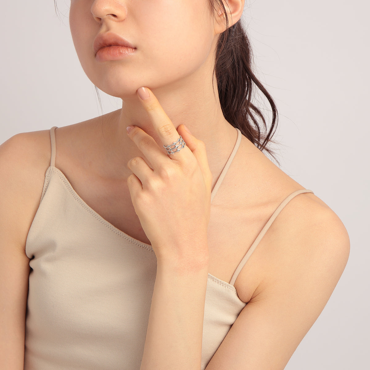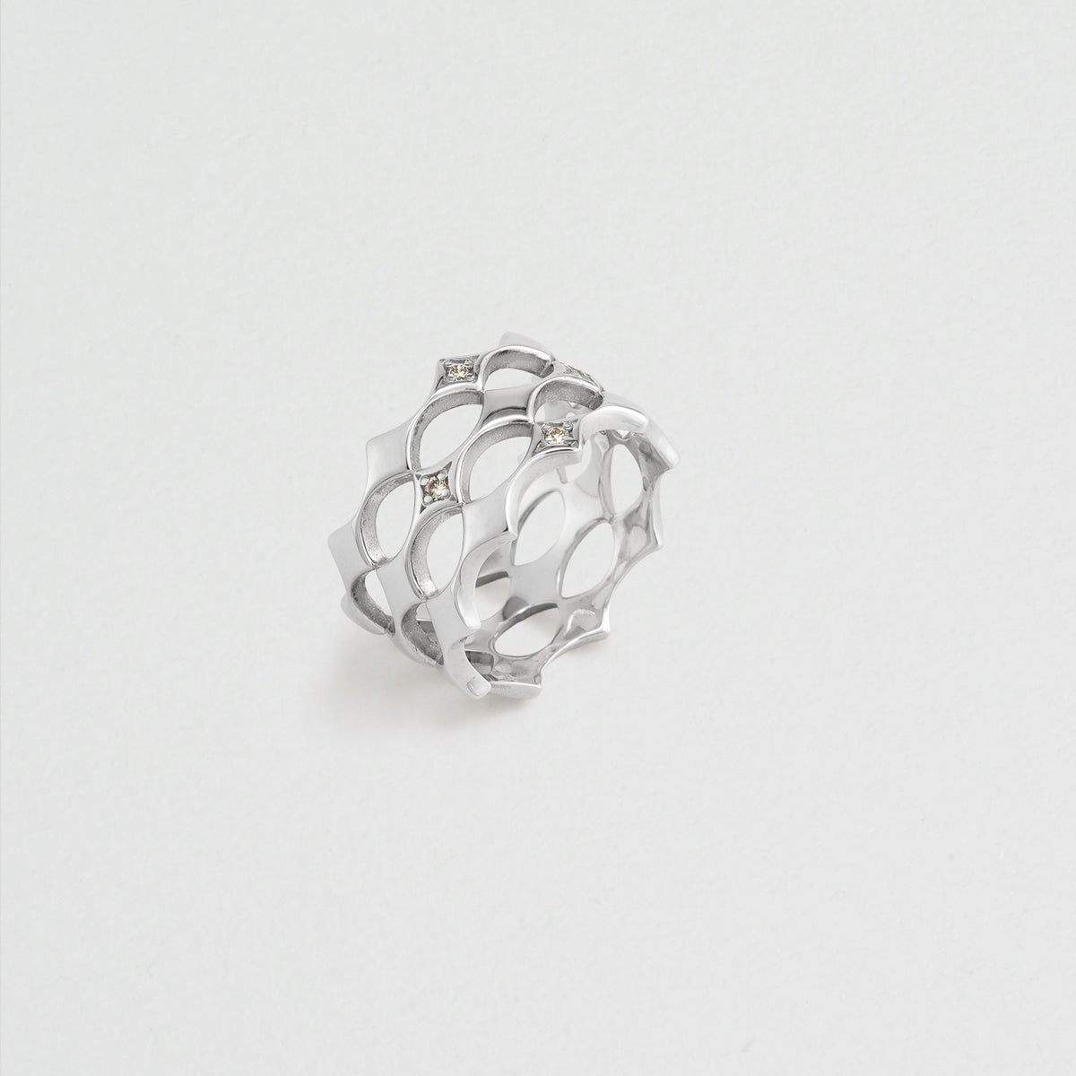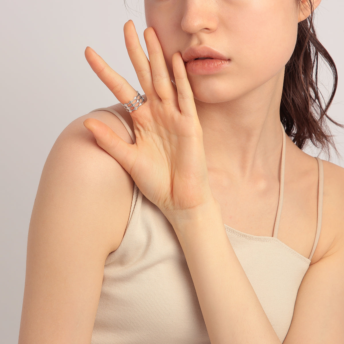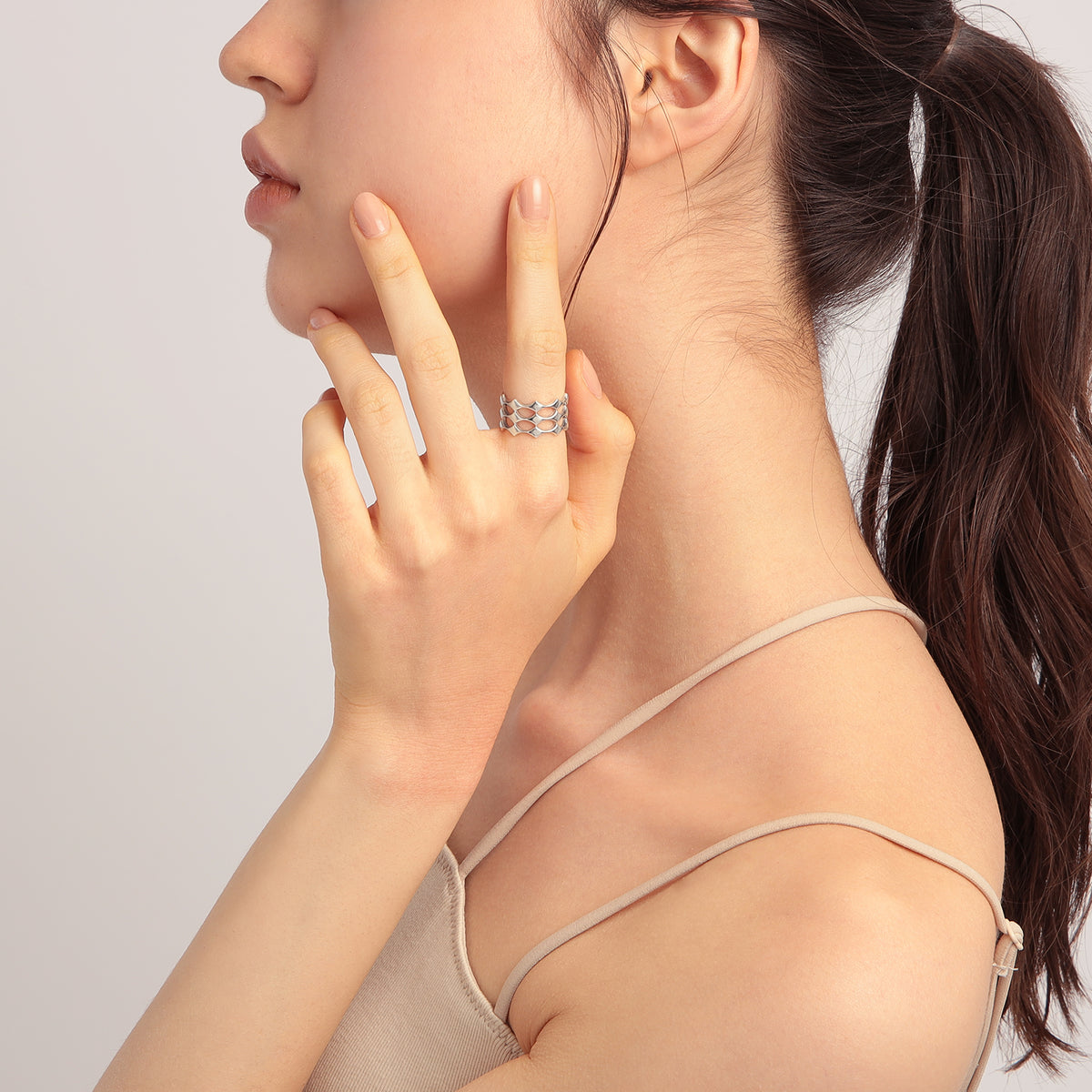 エナジェティックなしし座の季節をイメージした、光り輝くクラルスシルエットの3連リング。連なったアームに配された4石のダイヤモンドが生み出す、菱形シルエットのリズムが地金のシェイプを一層引き立てます。デイリースタイルからオケージョンまで、日々のコーディネートにプレシャスな輝きをそえてくれる計算されたボリューム感と、ダイヤモンドの揺るぎない輝きが、身にまとう人のパーソナリティと呼応するように存在感を放ちます。