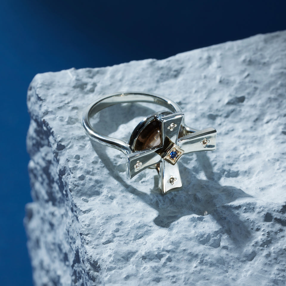 夏を司るロイヤルスター・レグルスからインスパイアされたリング。ラテン語で「小さな王」という意味を持つ星のイメージから、王家に継承される高貴なクラウン・ジュエルのような仕立てに。王冠のような立体感を持たせたモチーフには、レグルスの青みがかった輝きになぞらえ、清廉なサファイヤをセッティング。K10YGの石座と4石のブラウンダイヤモンドが、さらなる煌めきをもたらします。王位を象徴するオーブをイメージしたカボションカットのスモーキークォーツの石座には、幸運のタリスマンである八芒星をあしらい、自分だけのお守りモチーフをしのばせました。