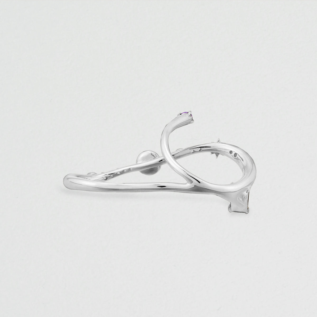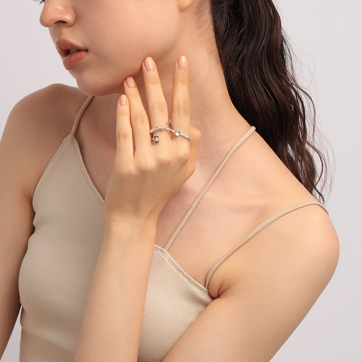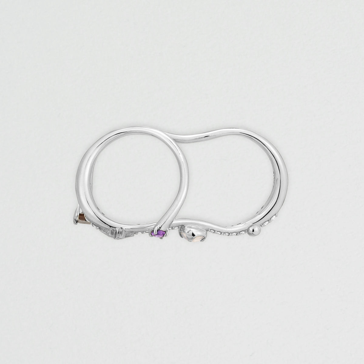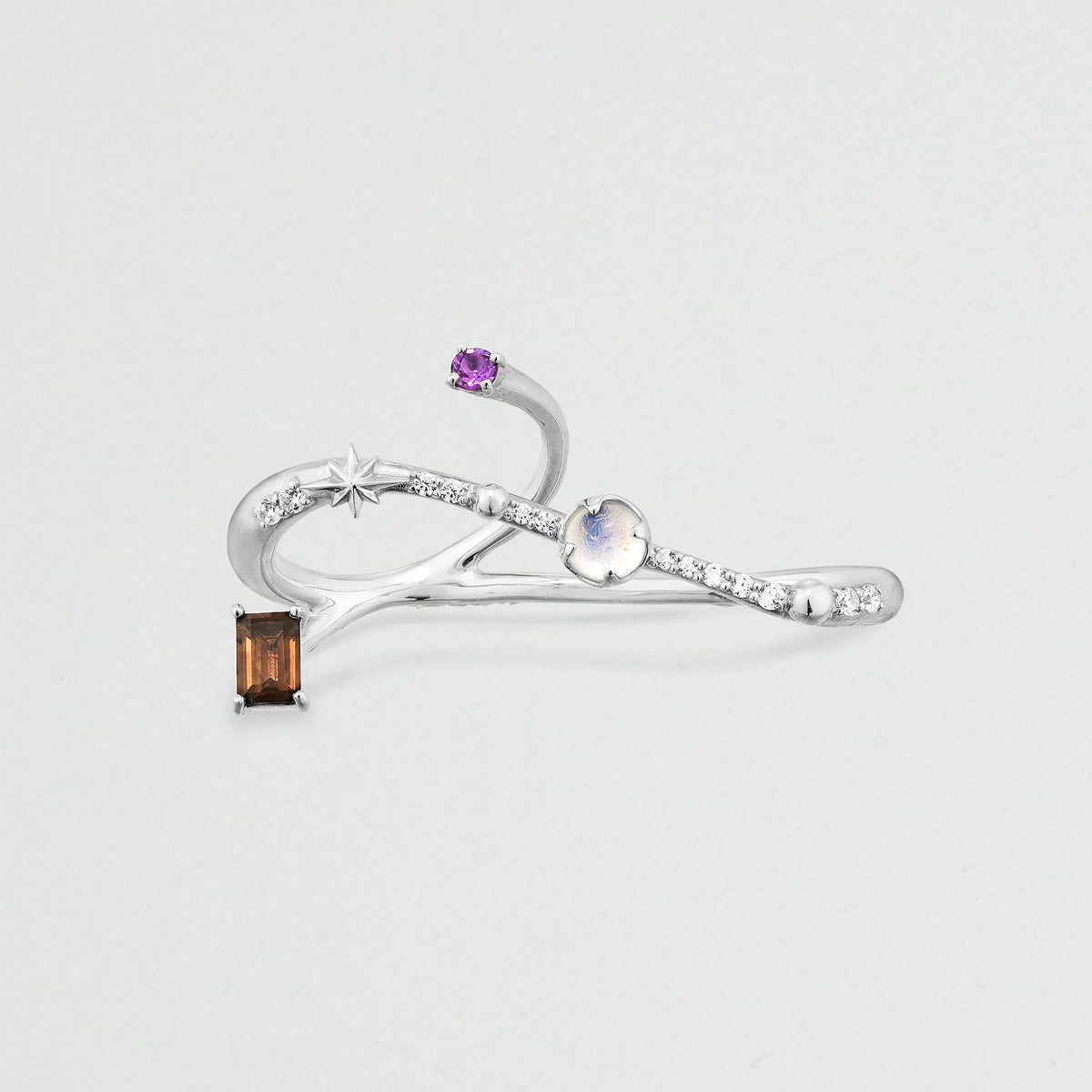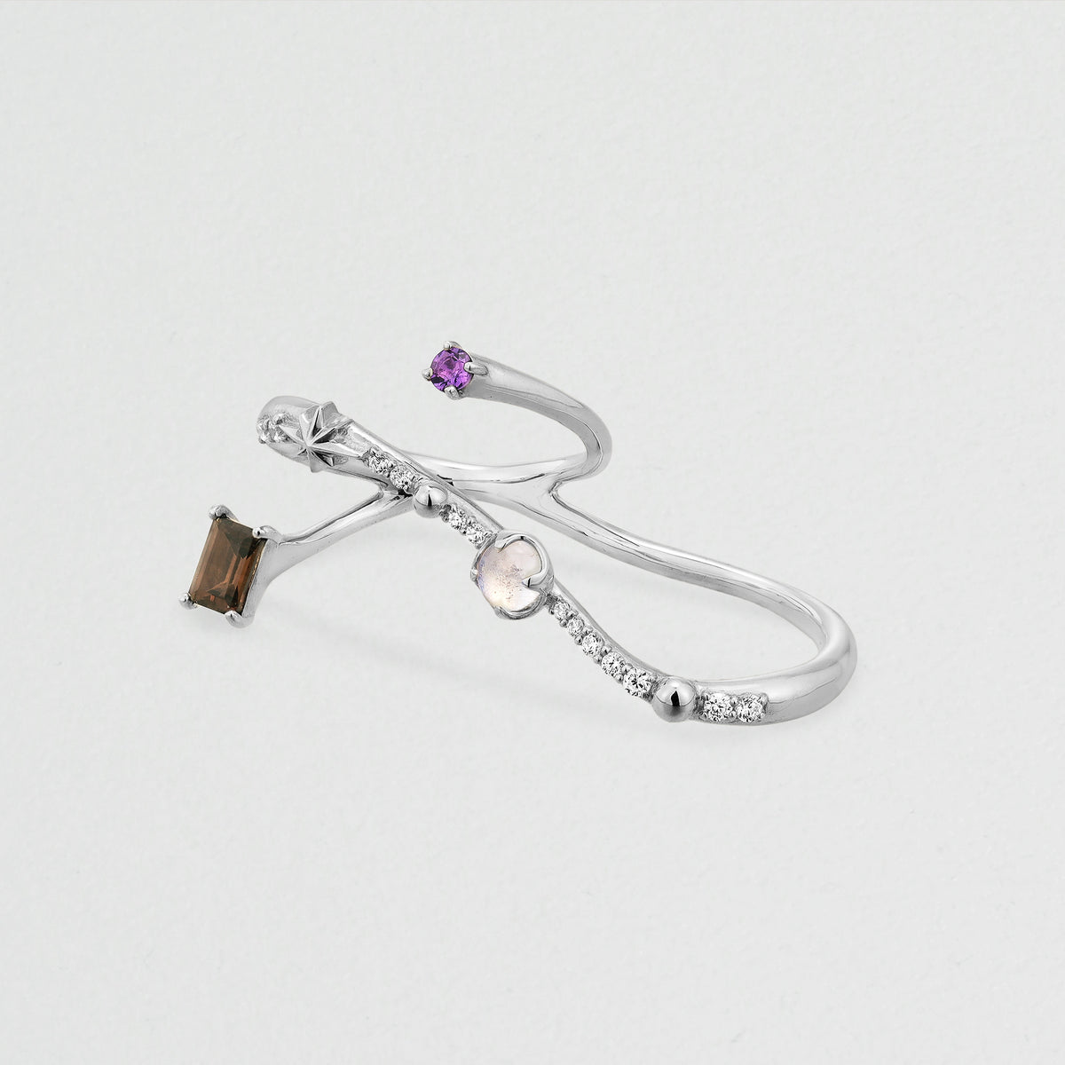 宇宙船が互いに速度を合わせ、同じ軌道上で接近する「Rendez-vous(ランデヴー)」。そのドラマティックな瞬間からインスパイアされた、ホリデーシーズンを彩るCosmic GEMリング。二つの機体の出会いを象ったロマンティックなダブルフィンガーリングは、カラーストーンの美しい浮遊感が手元で星のように瞬きます。月明かりを映すフェルスパー、宇宙の深淵を感じさせるスモーキークォーツ、真実の愛を照らすアメシスト。連なるキュービックジルコニアの煌めきは、まるで銀河鉄道のように指の上で光の軌跡を描きます。ストーンの合間にあしらわれた、幸運のオクタグラム(八芒星)モチーフもモダンなアクセントに。リングの持つ華やかなボリューム感が、コーディネートの主役として特別な存在感を放ちます。