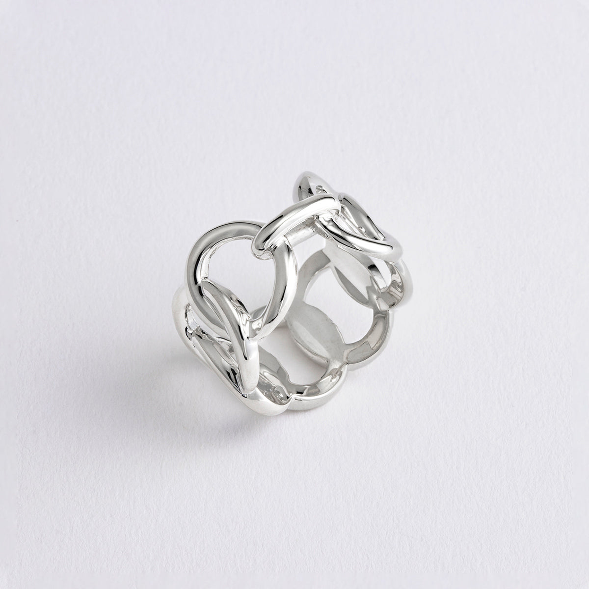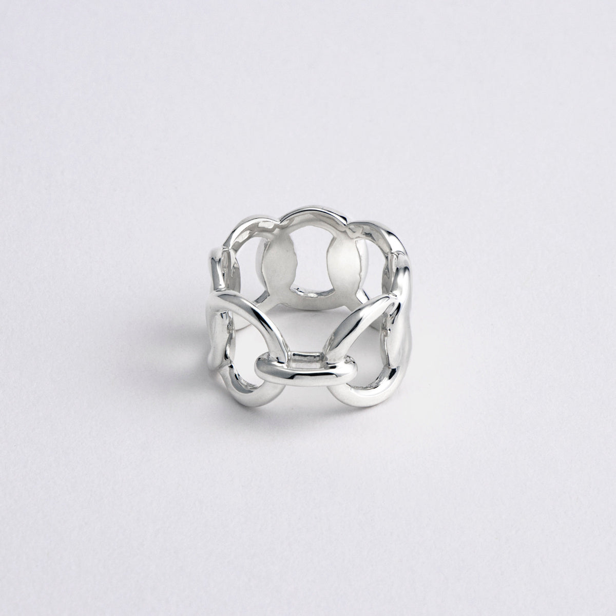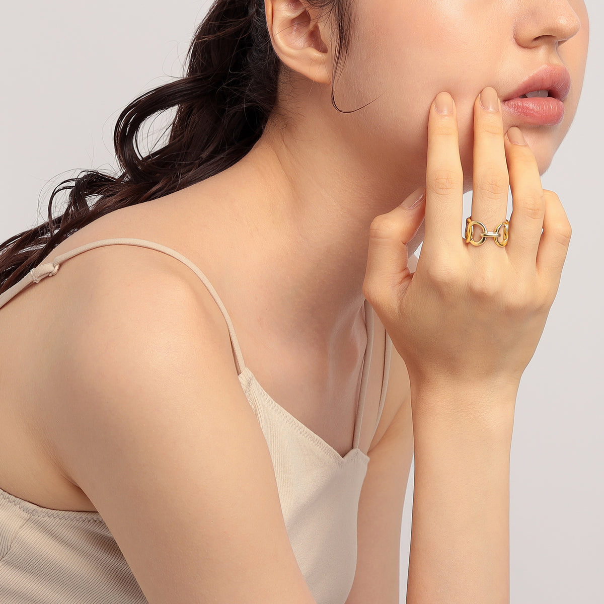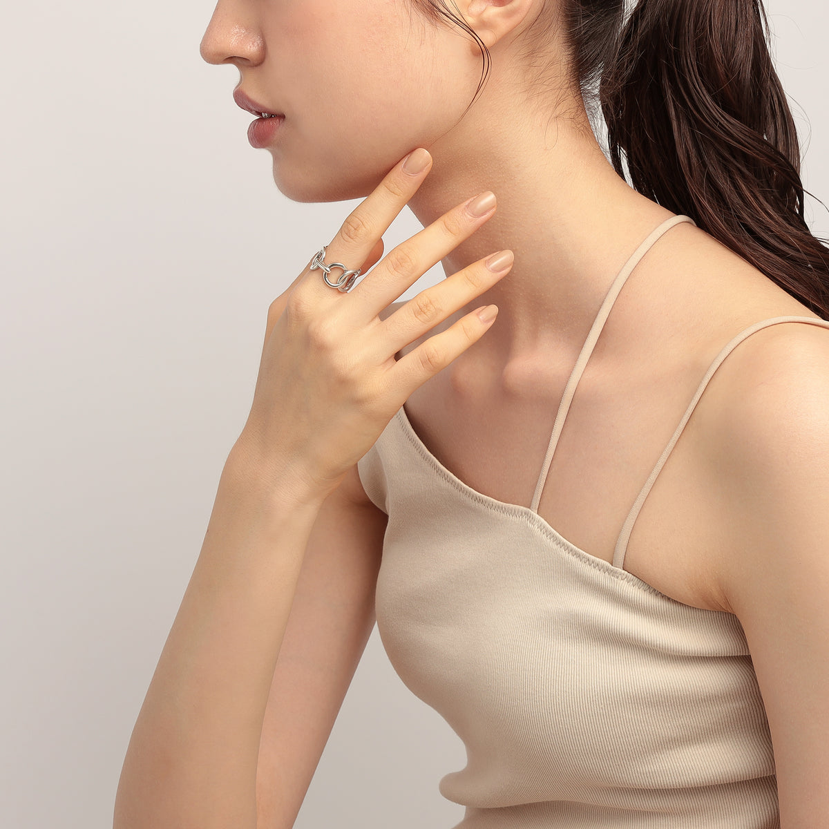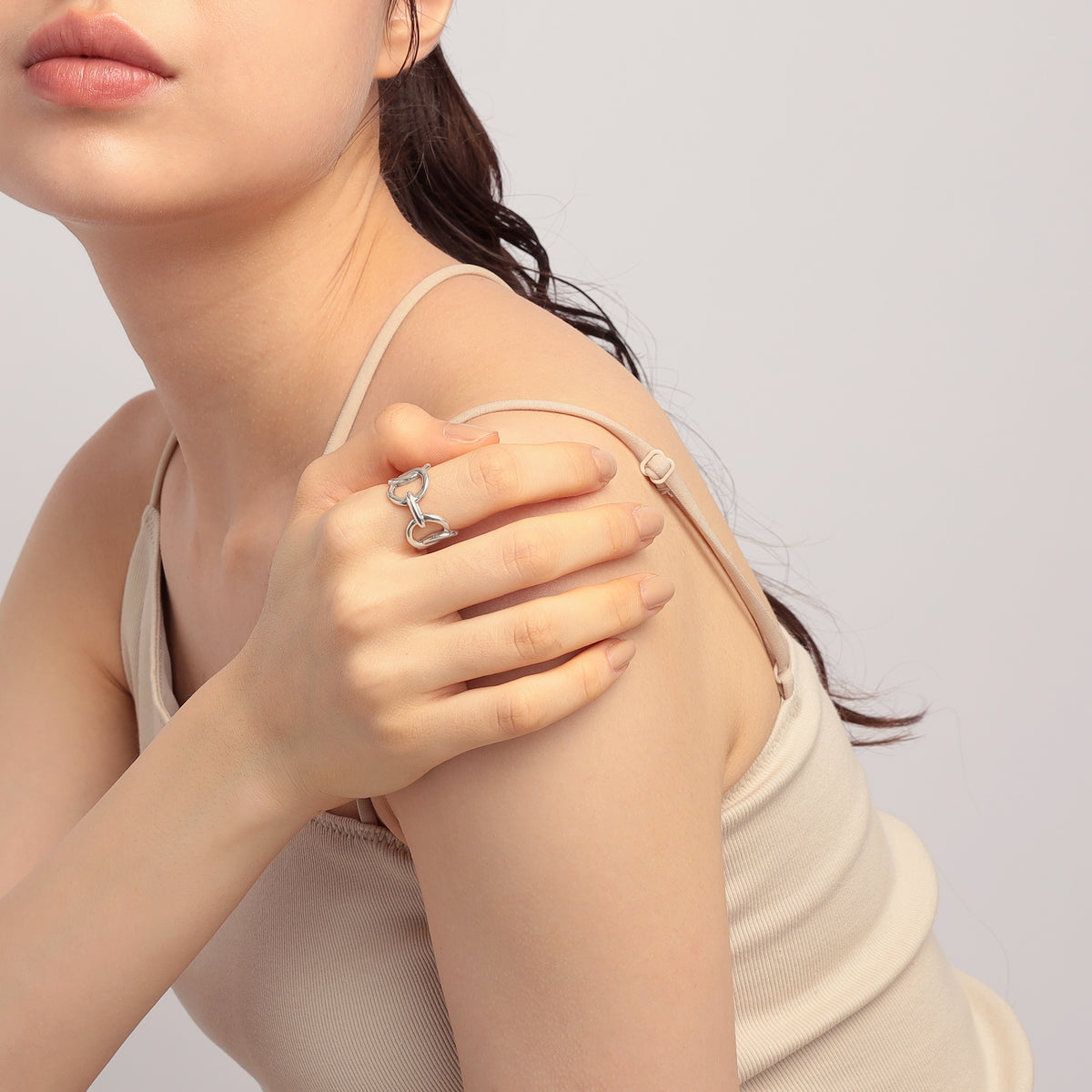 うお座の星座記号を大胆にアレンジした、アートピースのように美しいリング。連なるサークルはそれぞれがチェーンのコマのように絡み合い、どの角度から見ても美しい仕上がりです。ボリューム感がありながらも軽やかなフォルムは、そのしっとりとした重みもデザインの一部。確かな存在感をまとわせながらモダンな光を放ちます。艶やかに磨き上げられた地金の輝きが指先を美しく見せてくれ、印象的で表情豊かな手元に。指に吸い付くような着け心地の良さも魅力的。