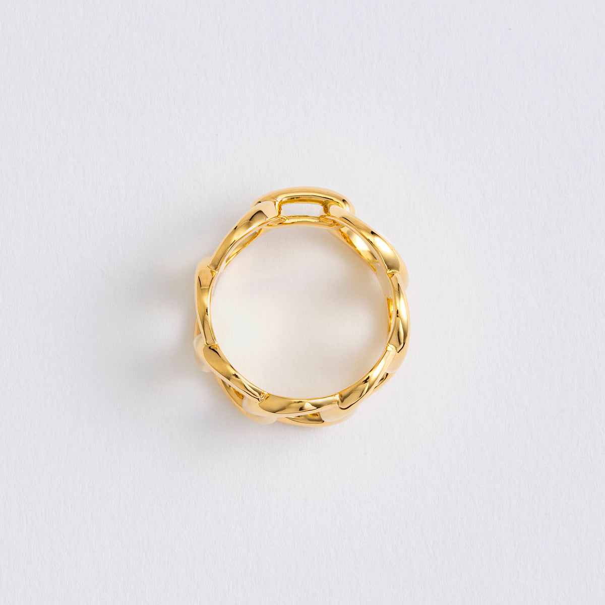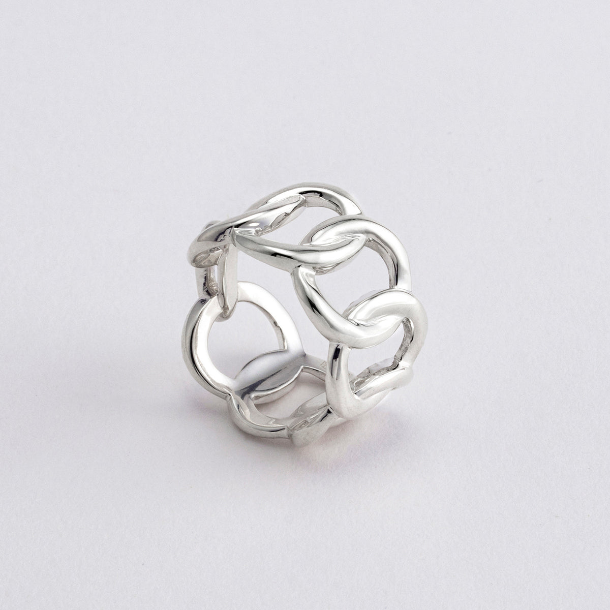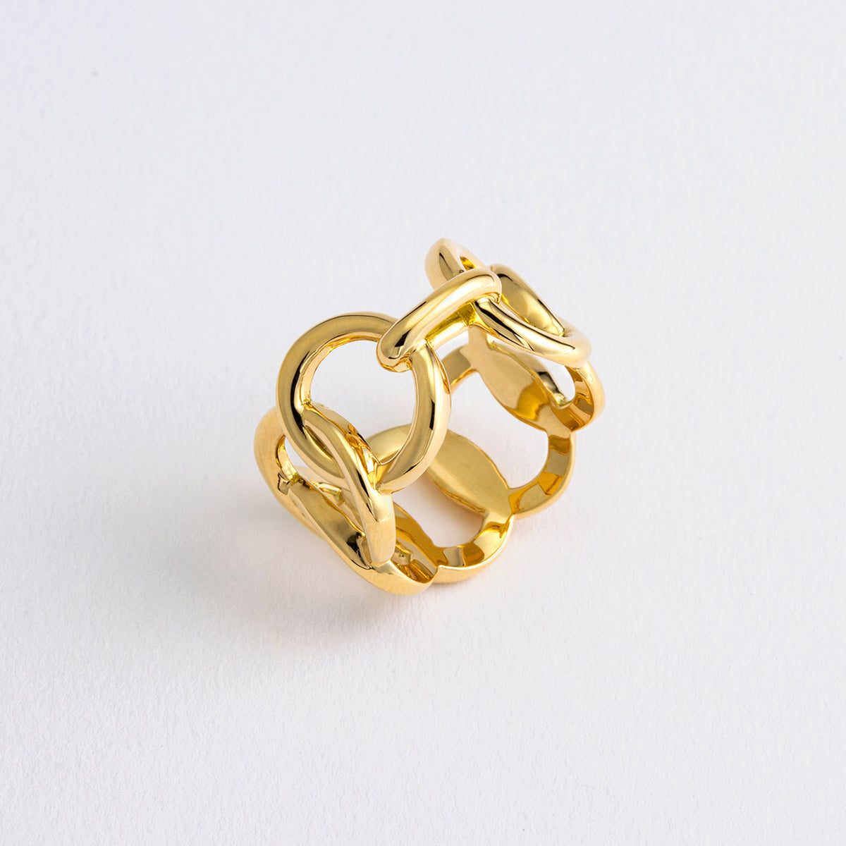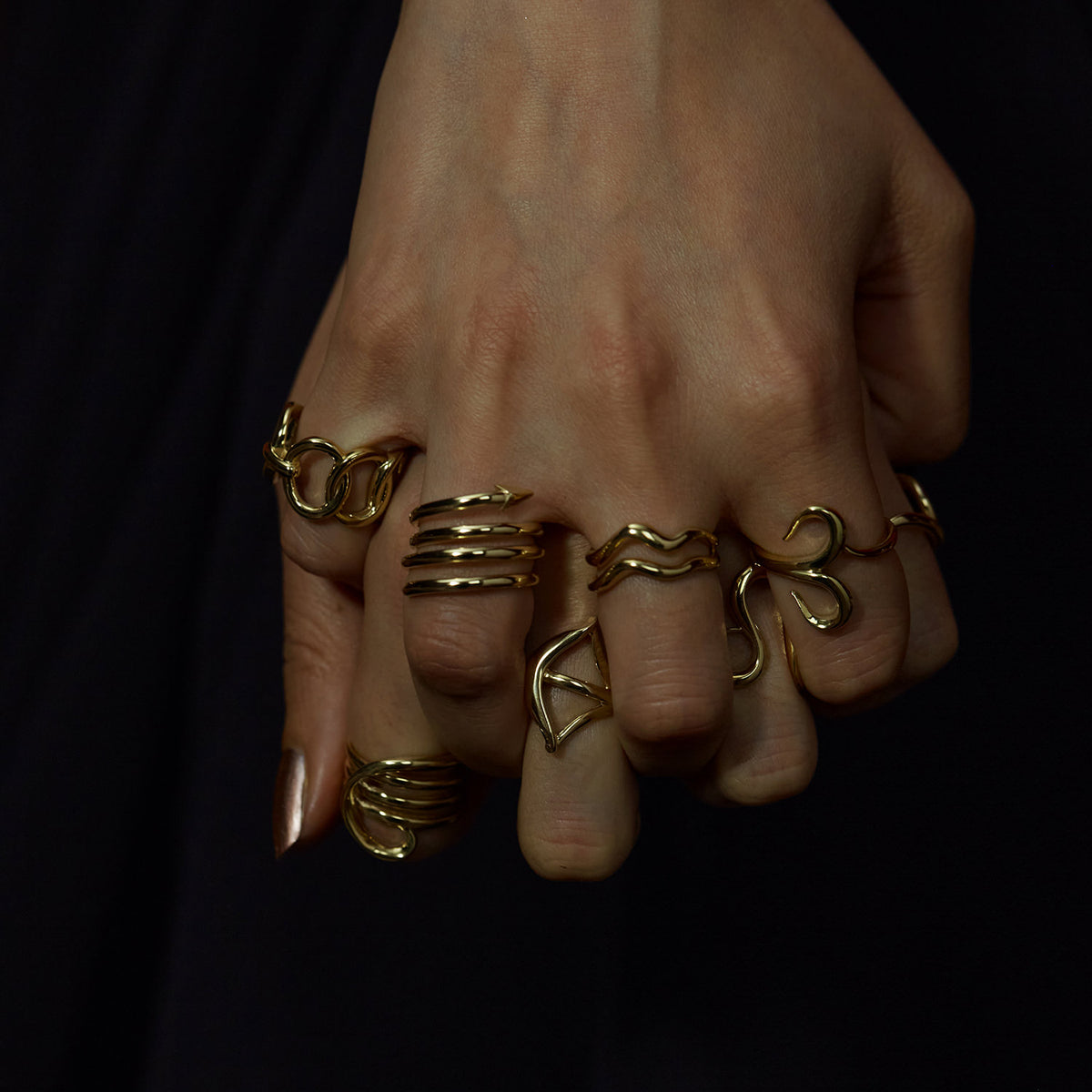 うお座の星座記号を大胆にアレンジした、アートピースのように美しいリング。連なるサークルはそれぞれがチェーンのコマのように絡み合い、どの角度から見ても美しい仕上がりです。ボリューム感がありながらも軽やかなフォルムは、そのしっとりとした重みもデザインの一部。確かな存在感をまとわせながらモダンな光を放ちます。艶やかに磨き上げられた地金の輝きが指先を美しく見せてくれ、印象的で表情豊かな手元に。指に吸い付くような着け心地の良さも魅力的。