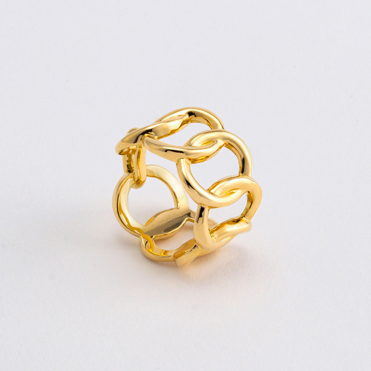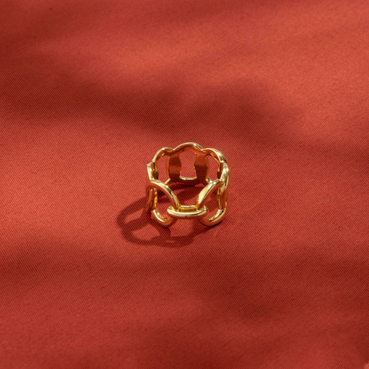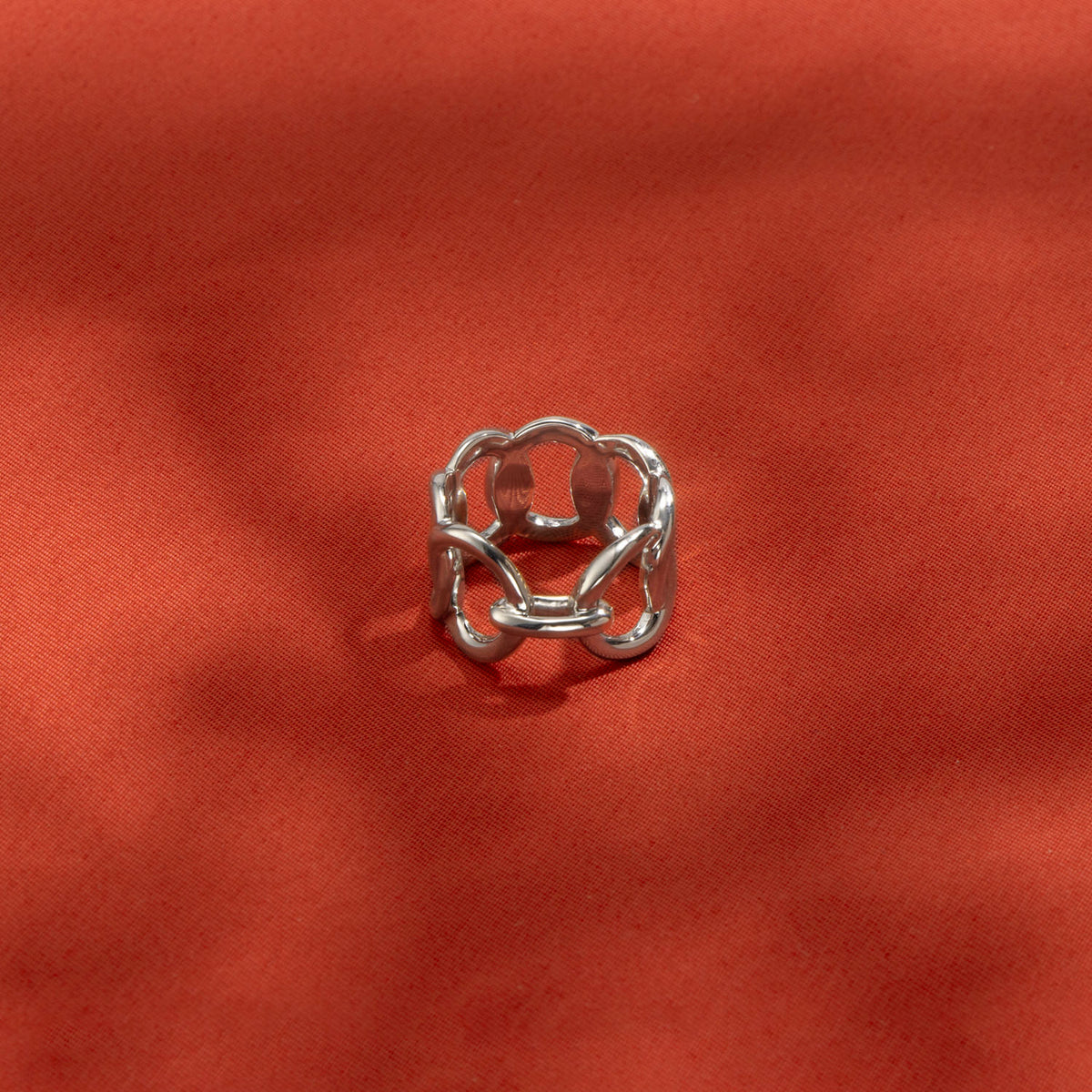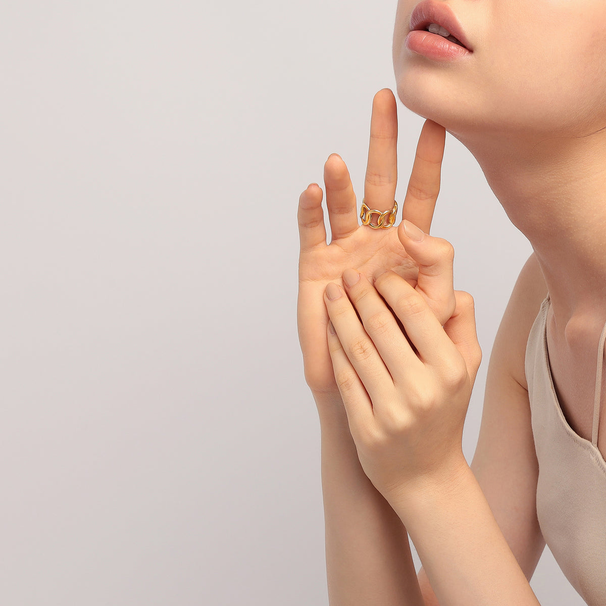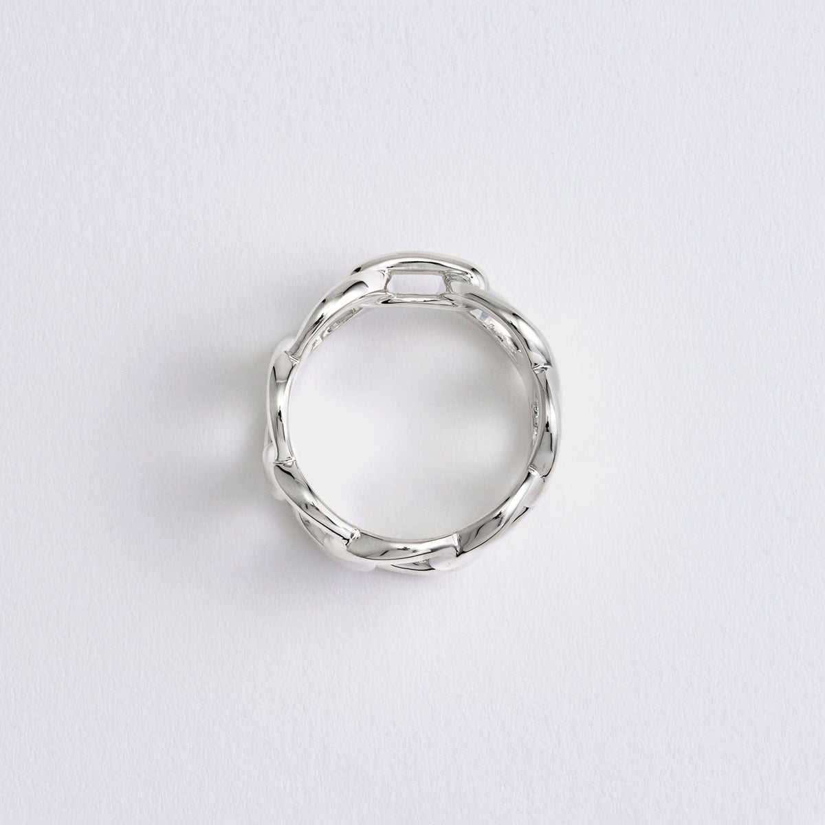 うお座の星座記号を大胆にアレンジした、アートピースのように美しいリング。連なるサークルはそれぞれがチェーンのコマのように絡み合い、どの角度から見ても美しい仕上がりです。ボリューム感がありながらも軽やかなフォルムは、そのしっとりとした重みもデザインの一部。確かな存在感をまとわせながらモダンな光を放ちます。艶やかに磨き上げられた地金の輝きが指先を美しく見せてくれ、印象的で表情豊かな手元に。指に吸い付くような着け心地の良さも魅力的。