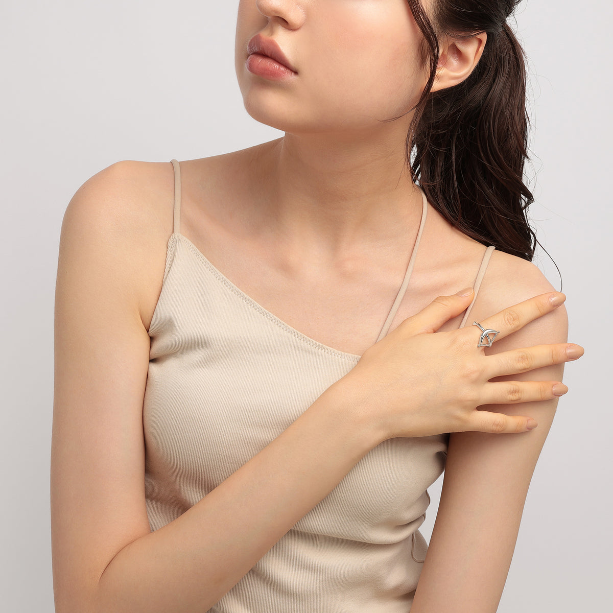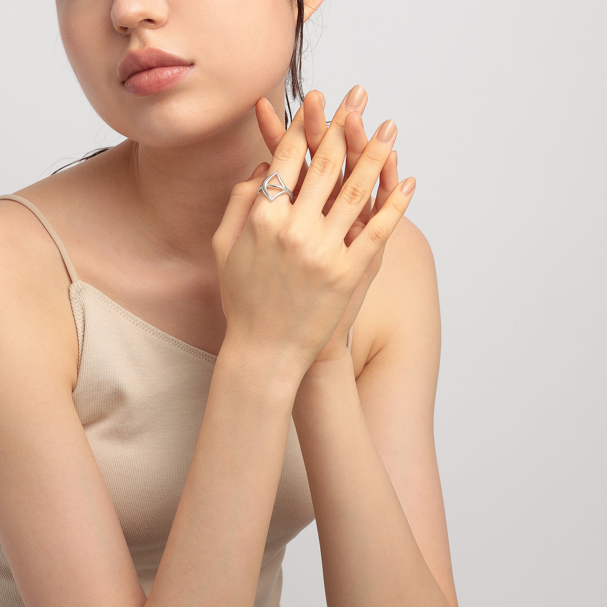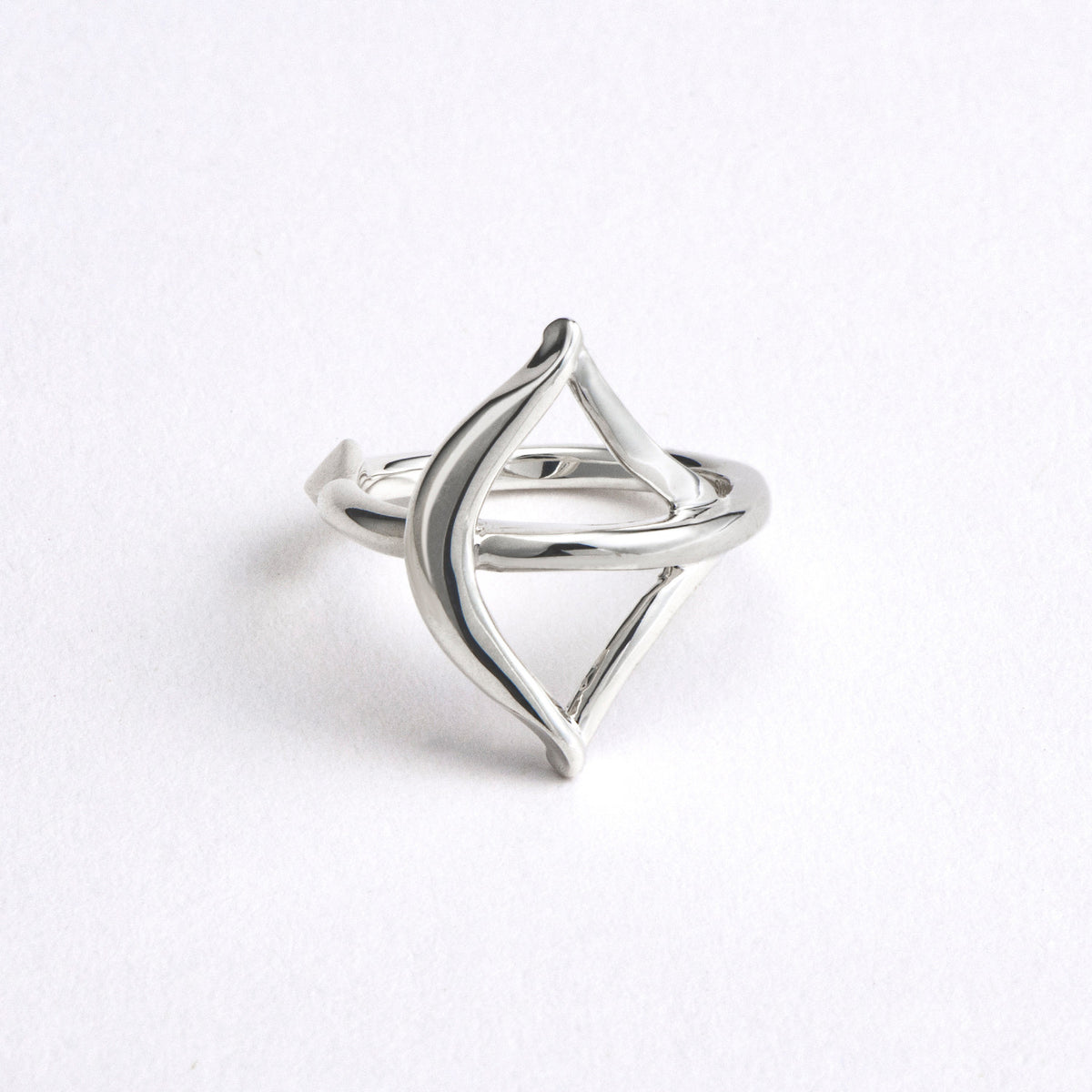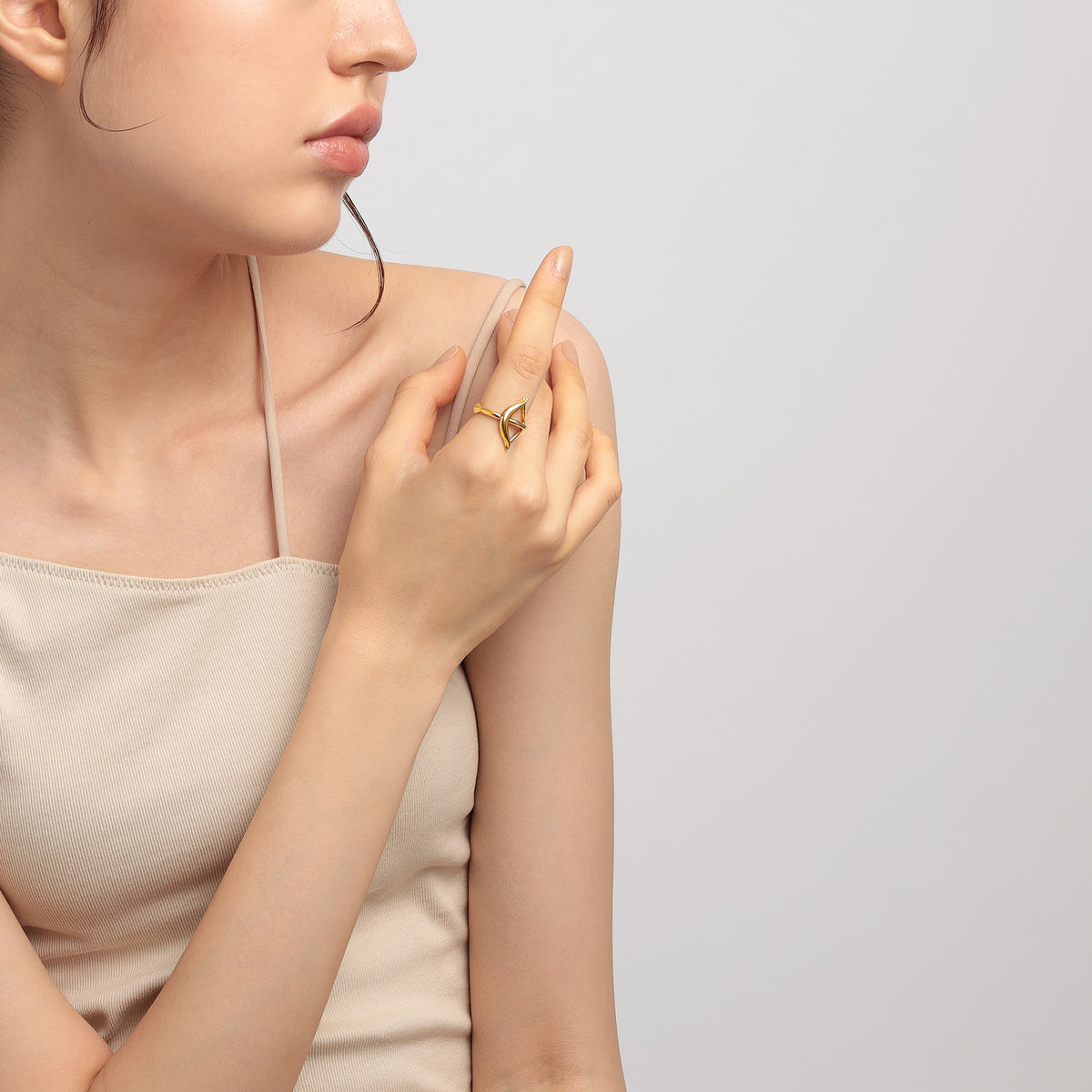 いて座の星座記号を大胆にアレンジした、アートピースのように美しいリング。弓から放たれるひとすじの矢が指に巻きつく、ドラマティックなデザインです。弓弦のふっくらとした表情や柔らかな陰影と真っ直ぐな矢とのコントラストがモダンな空気をまとわせます。デザインのポイントである矢の先端を見せるように着けるのもおすすめです。艶やかに磨き上げられた地金の輝きが指先を美しく見せてくれ、印象的で表情豊かな手元に。指に吸い付くような着け心地の良さも魅力的。