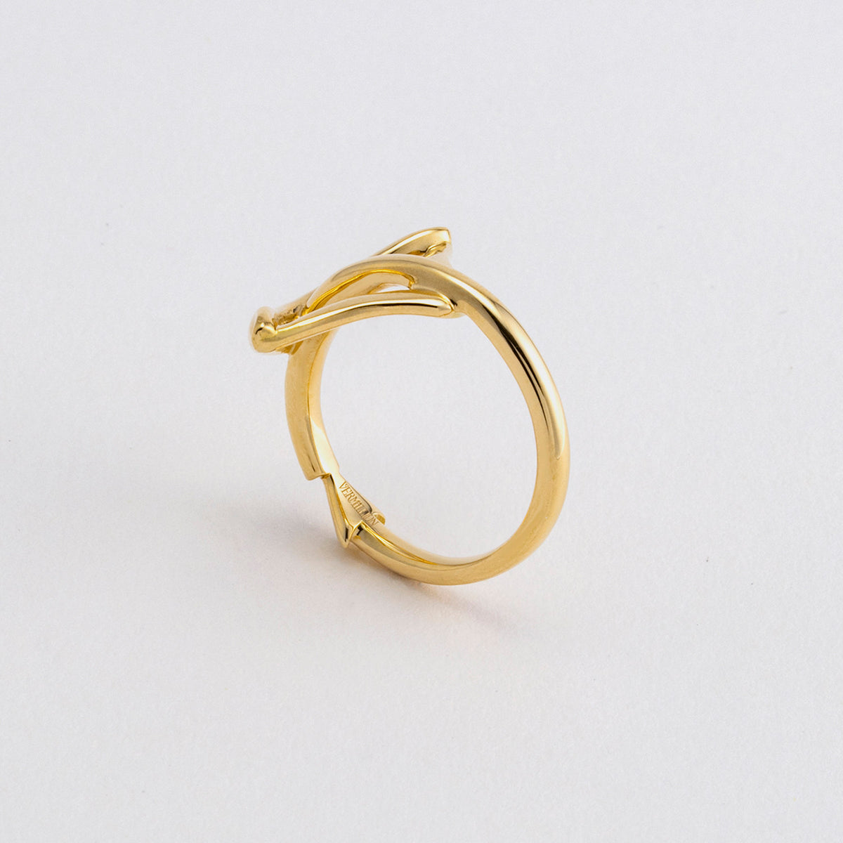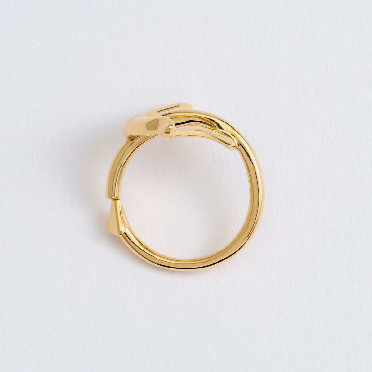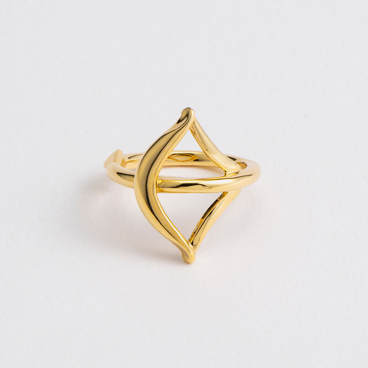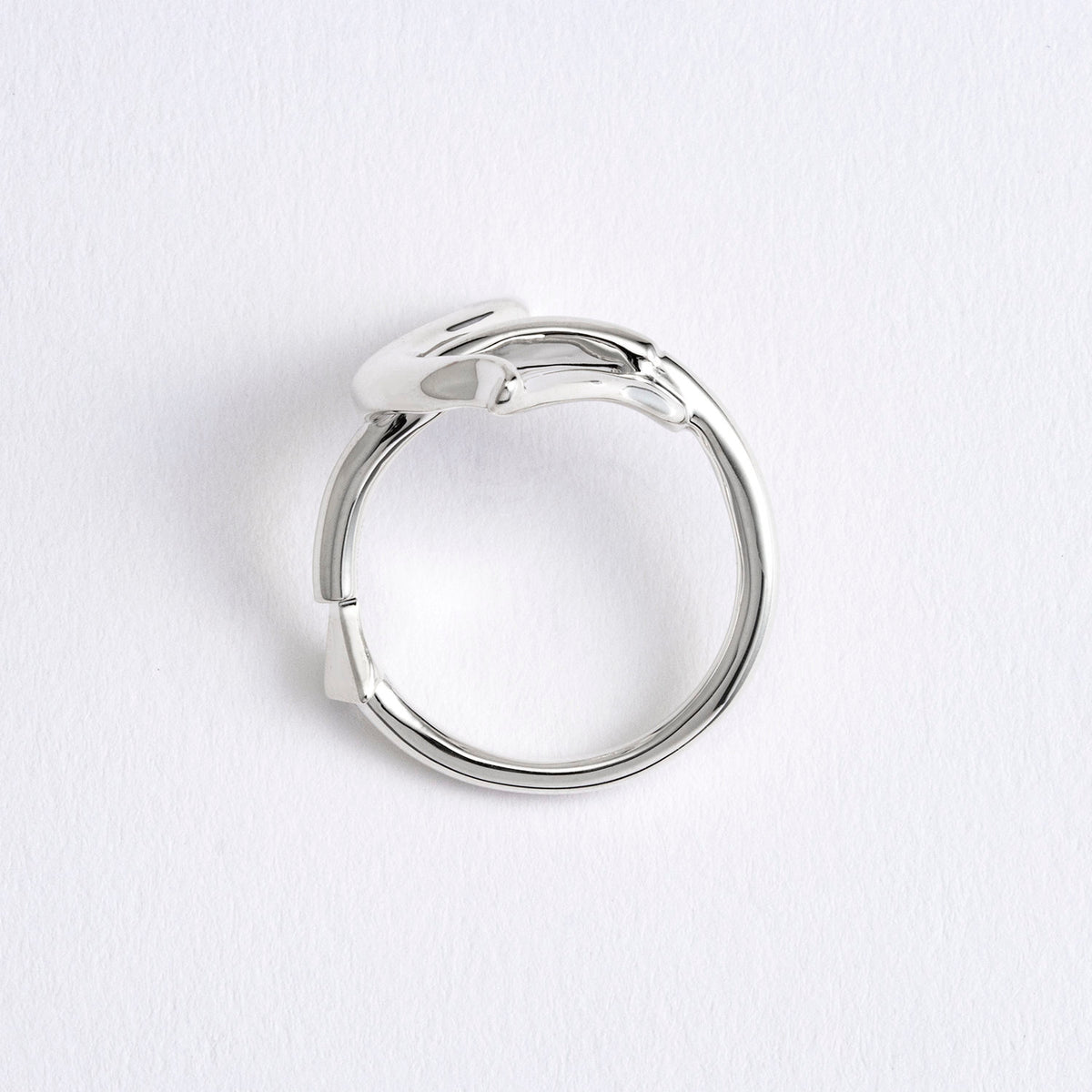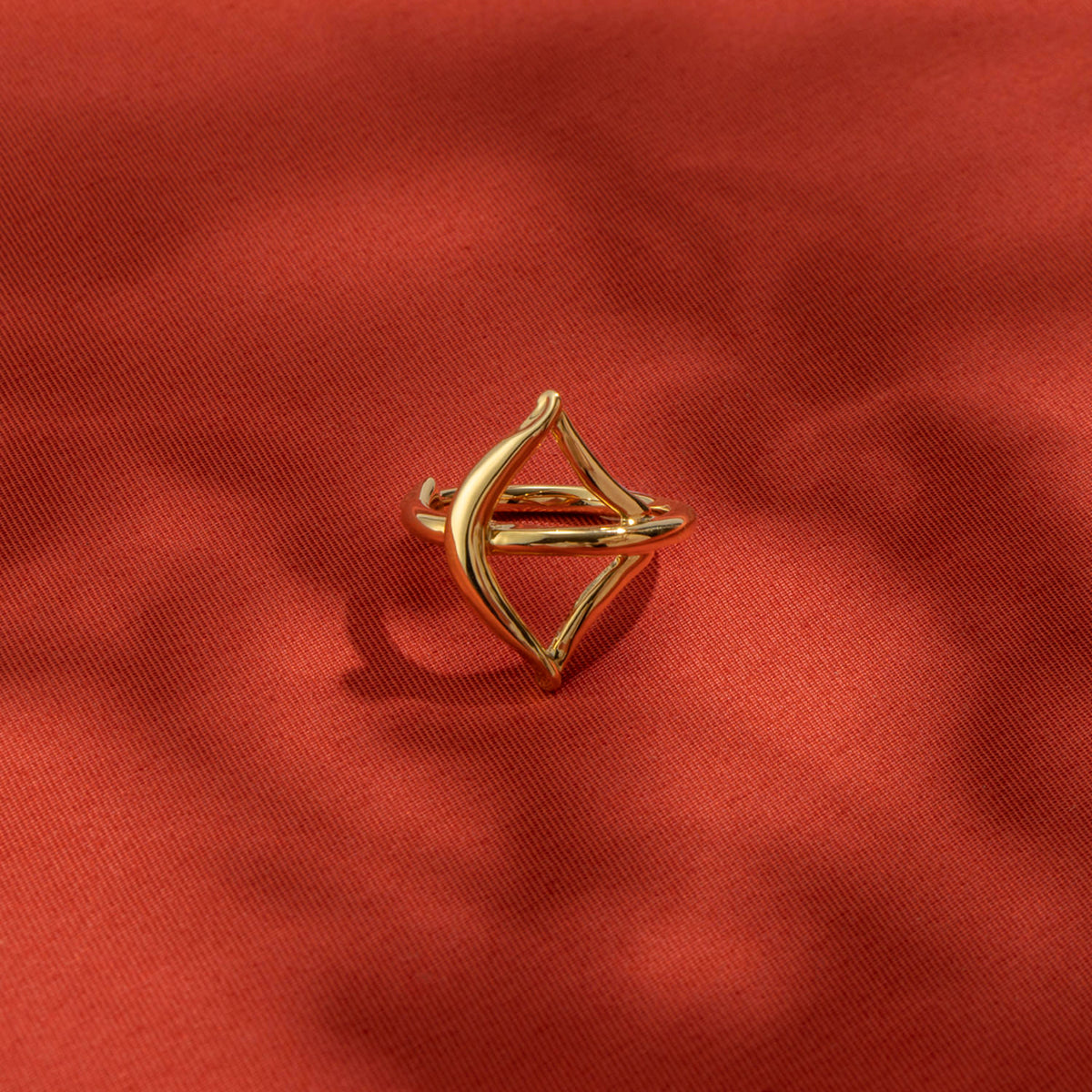 いて座の星座記号を大胆にアレンジした、アートピースのように美しいリング。弓から放たれるひとすじの矢が指に巻きつく、ドラマティックなデザインです。弓弦のふっくらとした表情や柔らかな陰影と真っ直ぐな矢とのコントラストがモダンな空気をまとわせます。デザインのポイントである矢の先端を見せるように着けるのもおすすめです。艶やかに磨き上げられた地金の輝きが指先を美しく見せてくれ、印象的で表情豊かな手元に。指に吸い付くような着け心地の良さも魅力的。