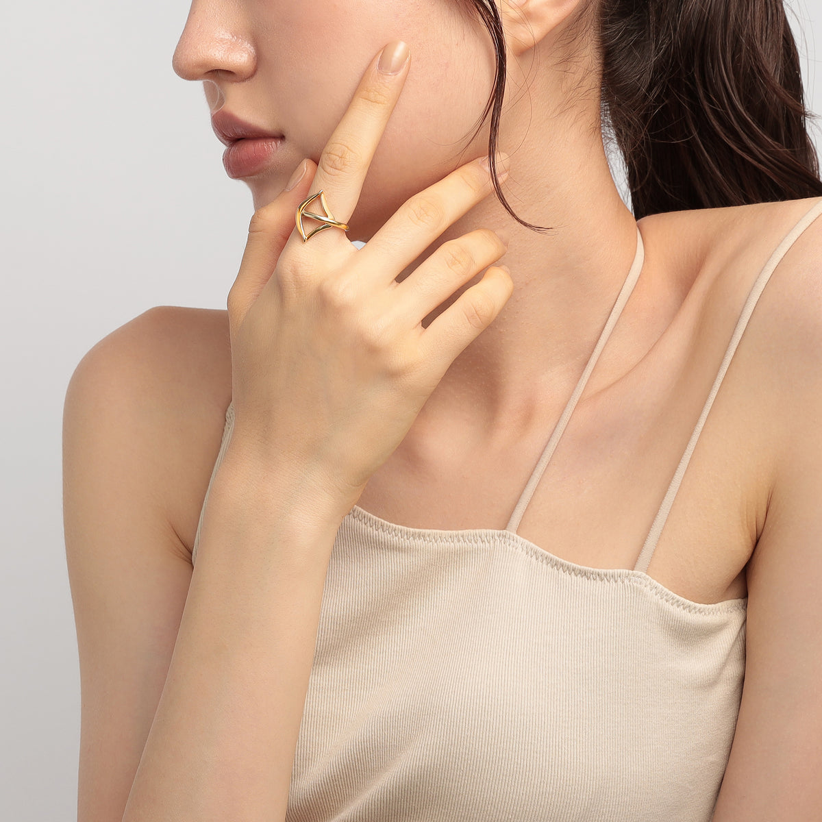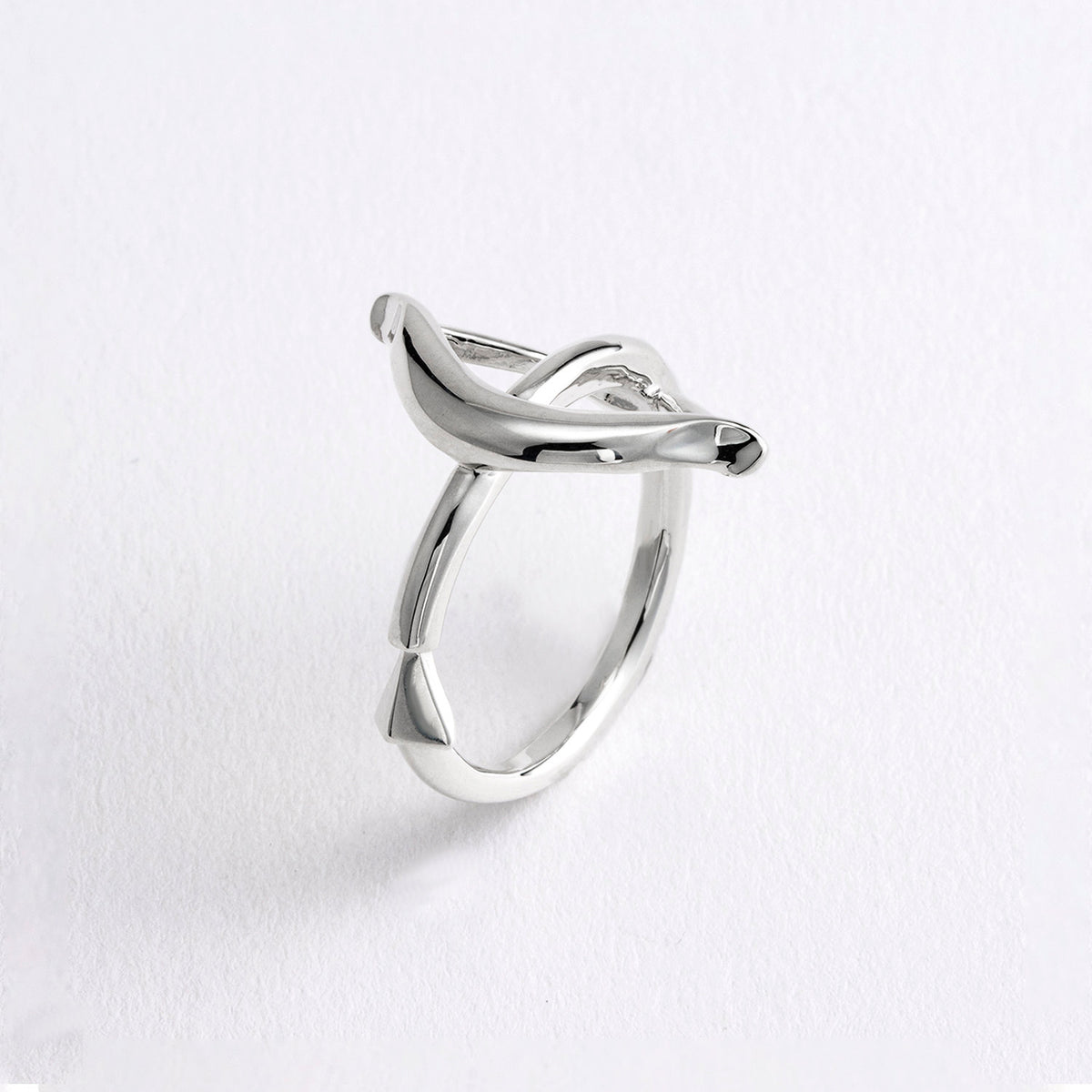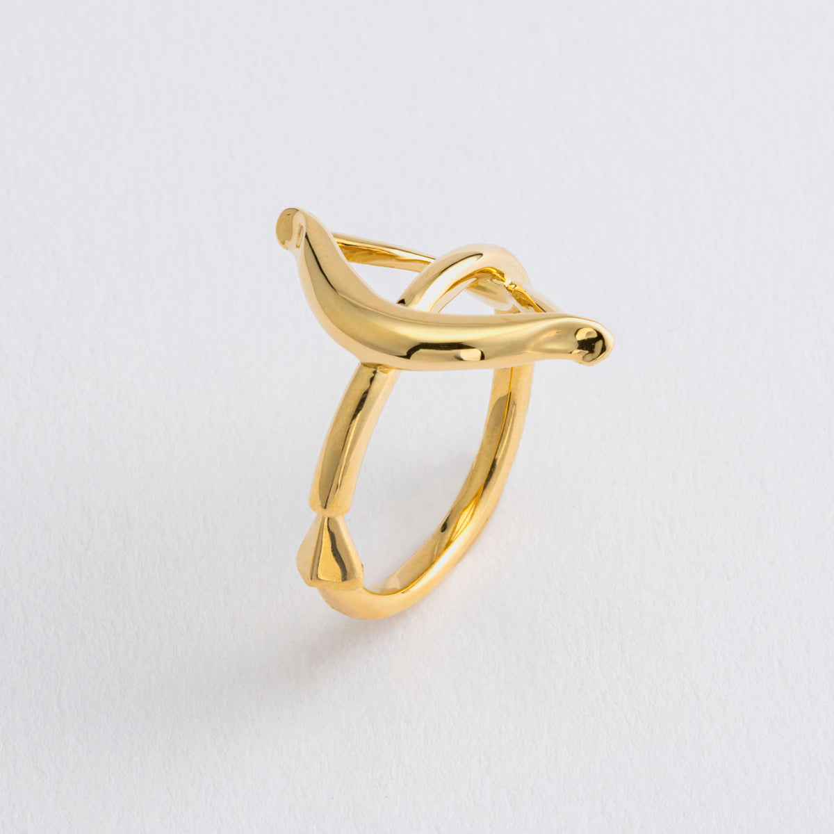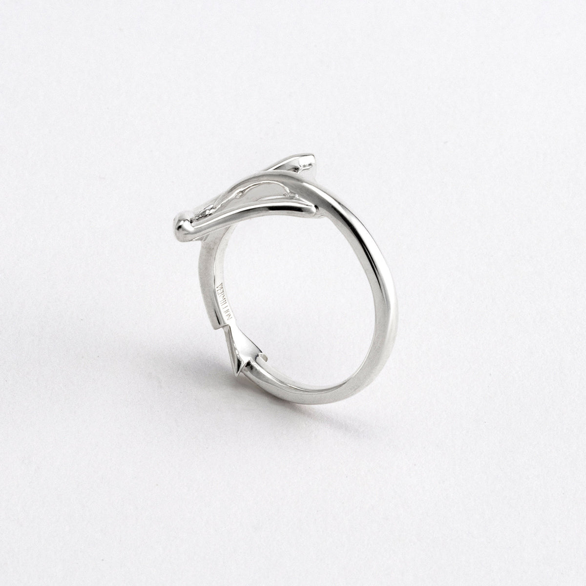 いて座の星座記号を大胆にアレンジした、アートピースのように美しいリング。弓から放たれるひとすじの矢が指に巻きつく、ドラマティックなデザインです。弓弦のふっくらとした表情や柔らかな陰影と真っ直ぐな矢とのコントラストがモダンな空気をまとわせます。デザインのポイントである矢の先端を見せるように着けるのもおすすめです。艶やかに磨き上げられた地金の輝きが指先を美しく見せてくれ、印象的で表情豊かな手元に。指に吸い付くような着け心地の良さも魅力的。