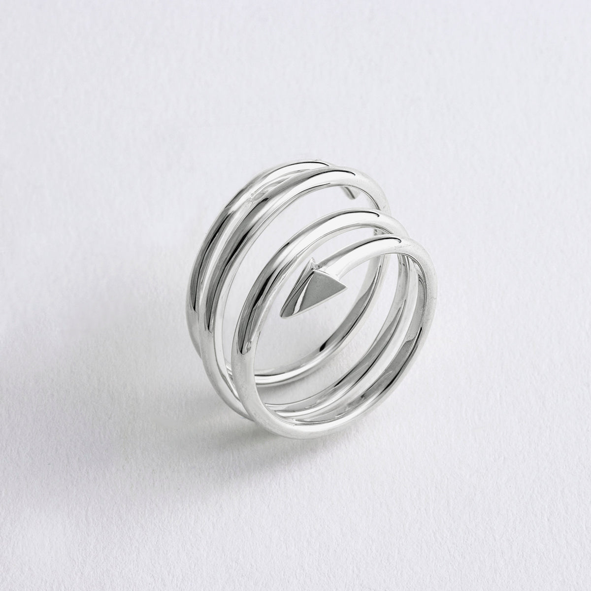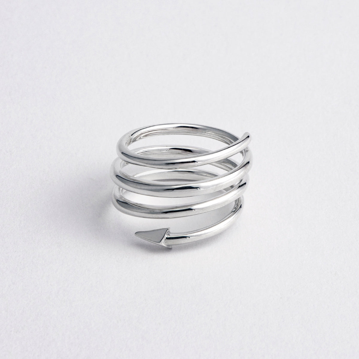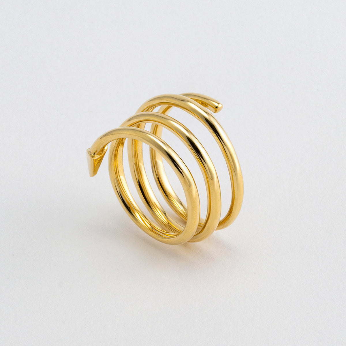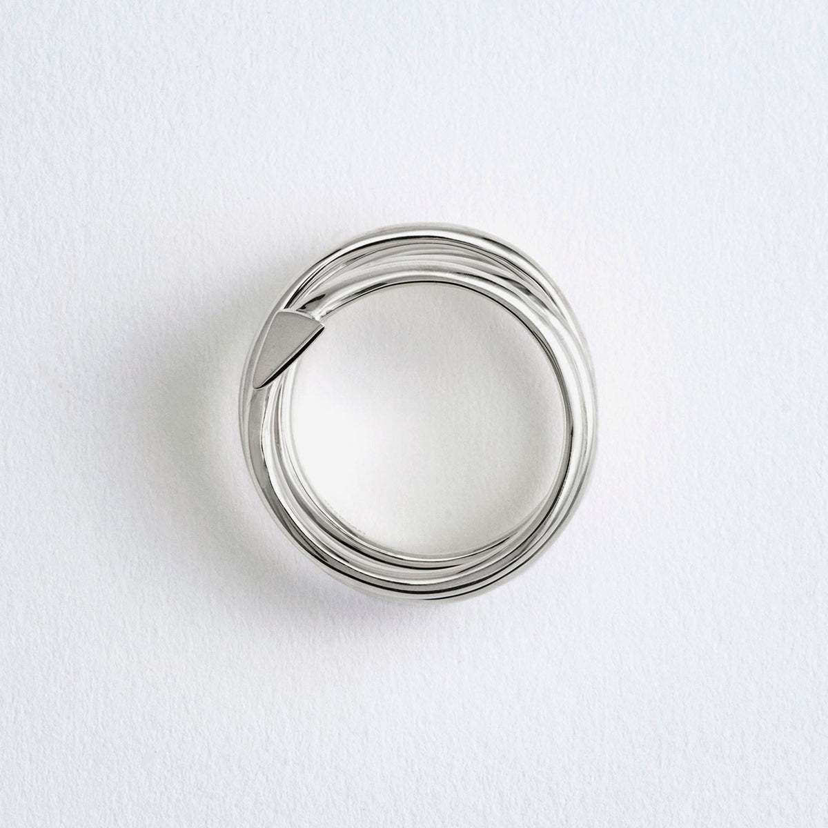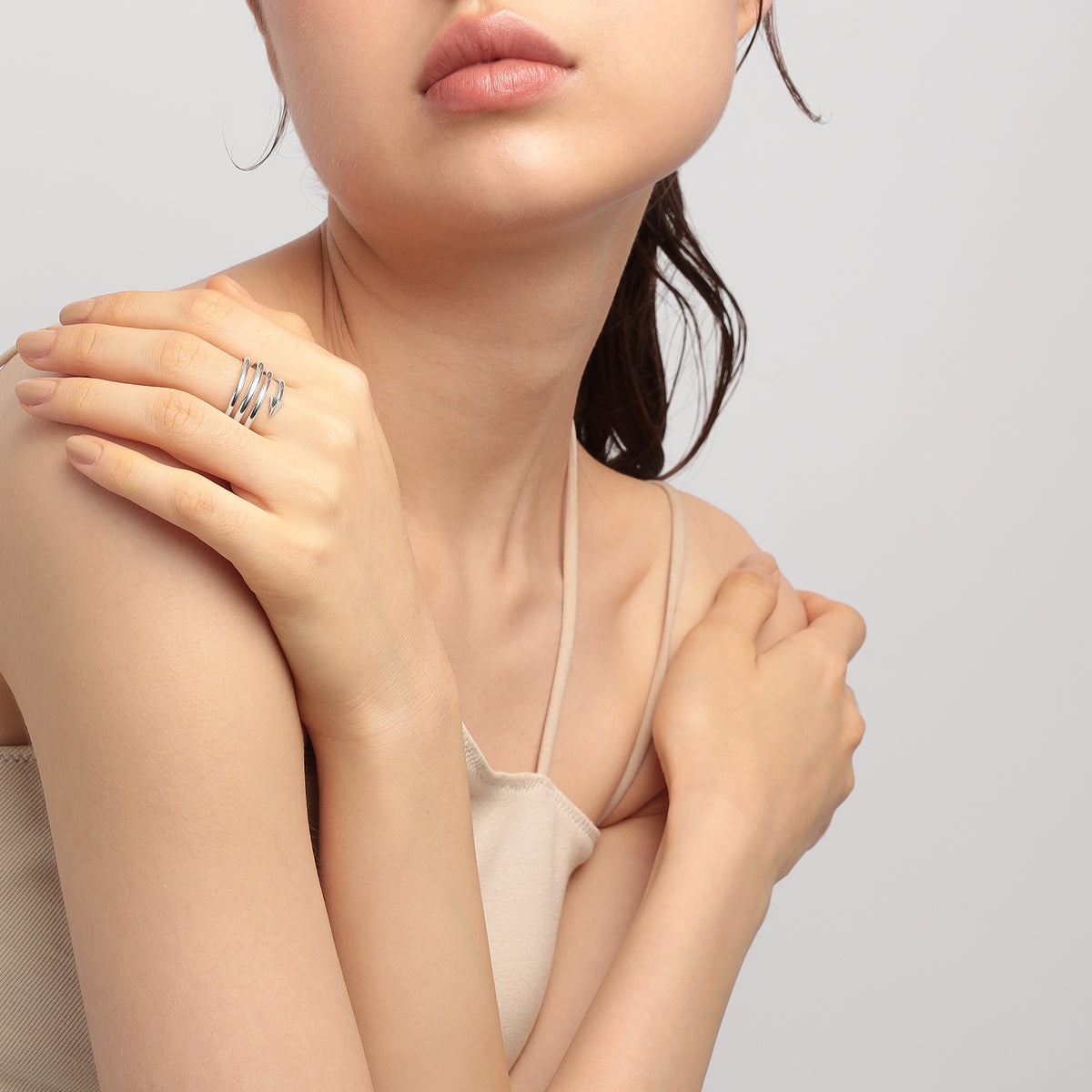 さそり座の星座記号を大胆にアレンジした、アートピースのように美しいリング。指に巻きつくような螺旋のフォルムとリング先端の三角形がモダンさと力強さを感じさせます。連なった3つの輪は中心だけわずかに変化をつけ、ダイナミックな動きの中に心地よいリズム感を生み出しています。艶やかに磨き上げられた地金の輝きが指先を美しく見せてくれ、印象的で表情豊かな手元に。指に吸い付くような着け心地の良さも魅力的。