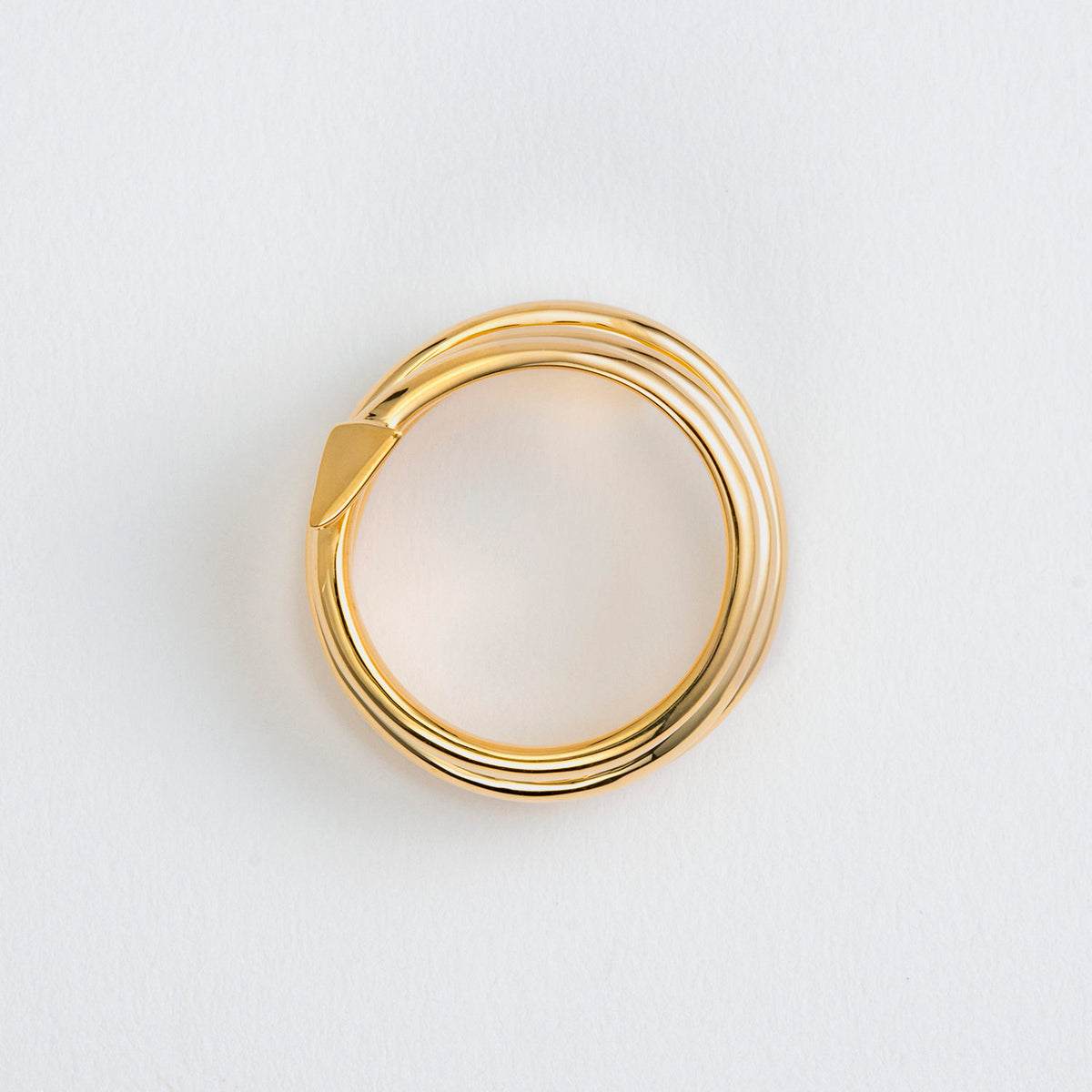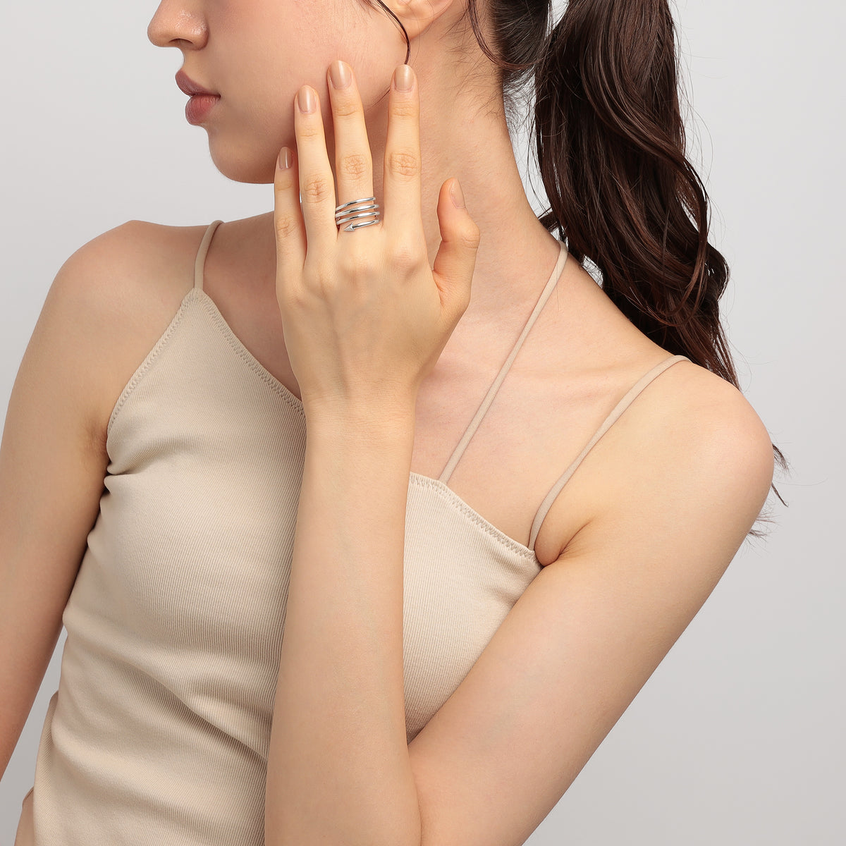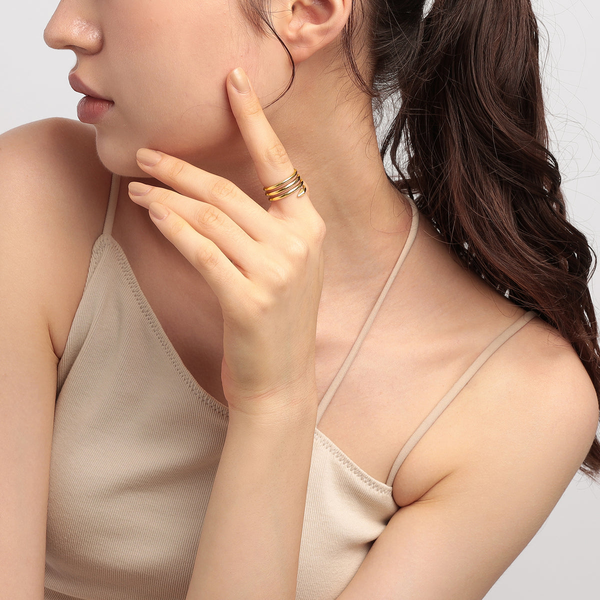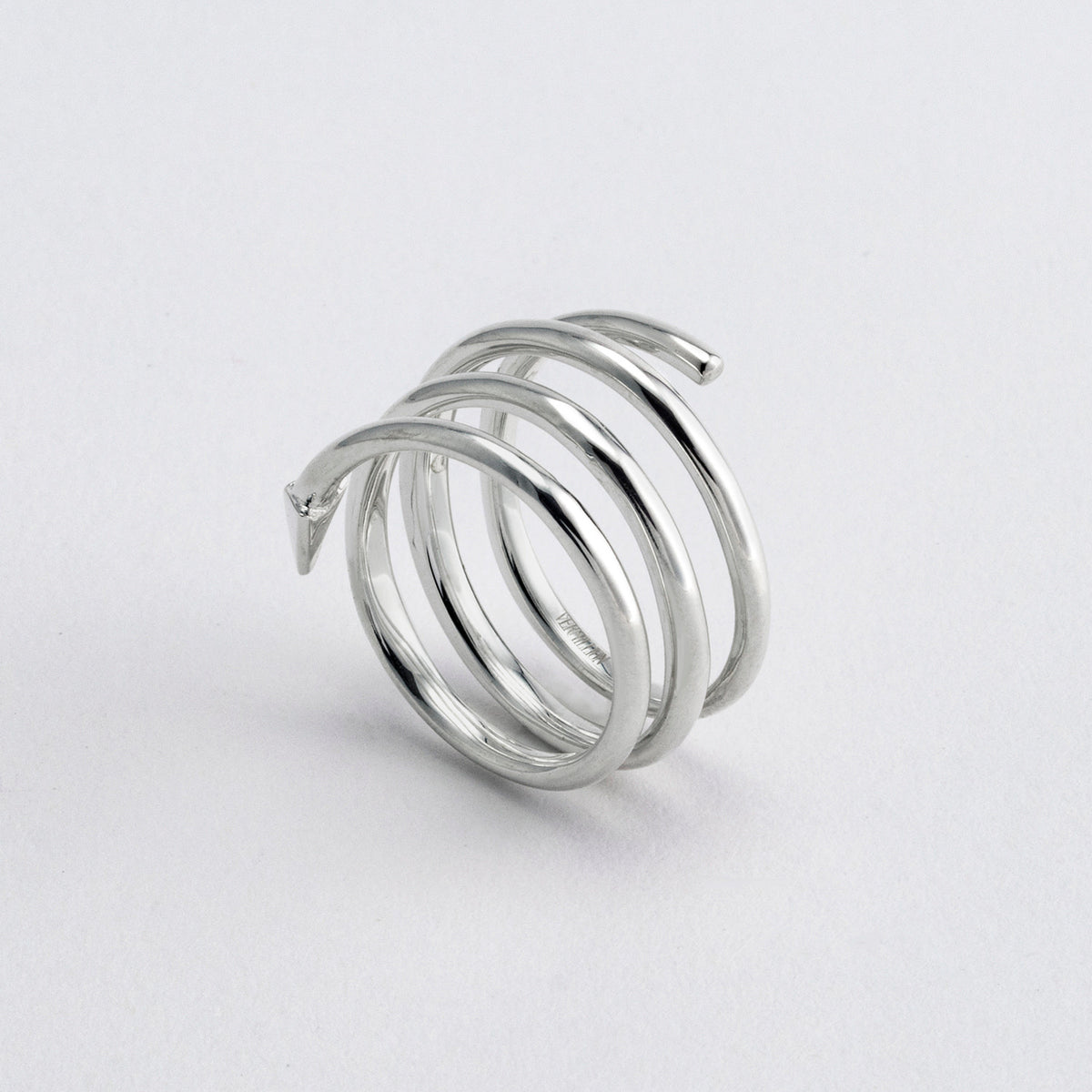 さそり座の星座記号を大胆にアレンジした、アートピースのように美しいリング。指に巻きつくような螺旋のフォルムとリング先端の三角形がモダンさと力強さを感じさせます。連なった3つの輪は中心だけわずかに変化をつけ、ダイナミックな動きの中に心地よいリズム感を生み出しています。艶やかに磨き上げられた地金の輝きが指先を美しく見せてくれ、印象的で表情豊かな手元に。指に吸い付くような着け心地の良さも魅力的。