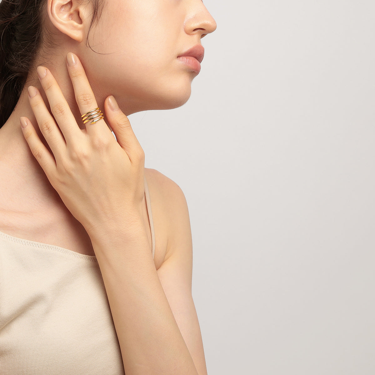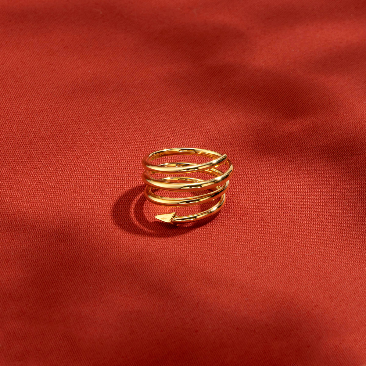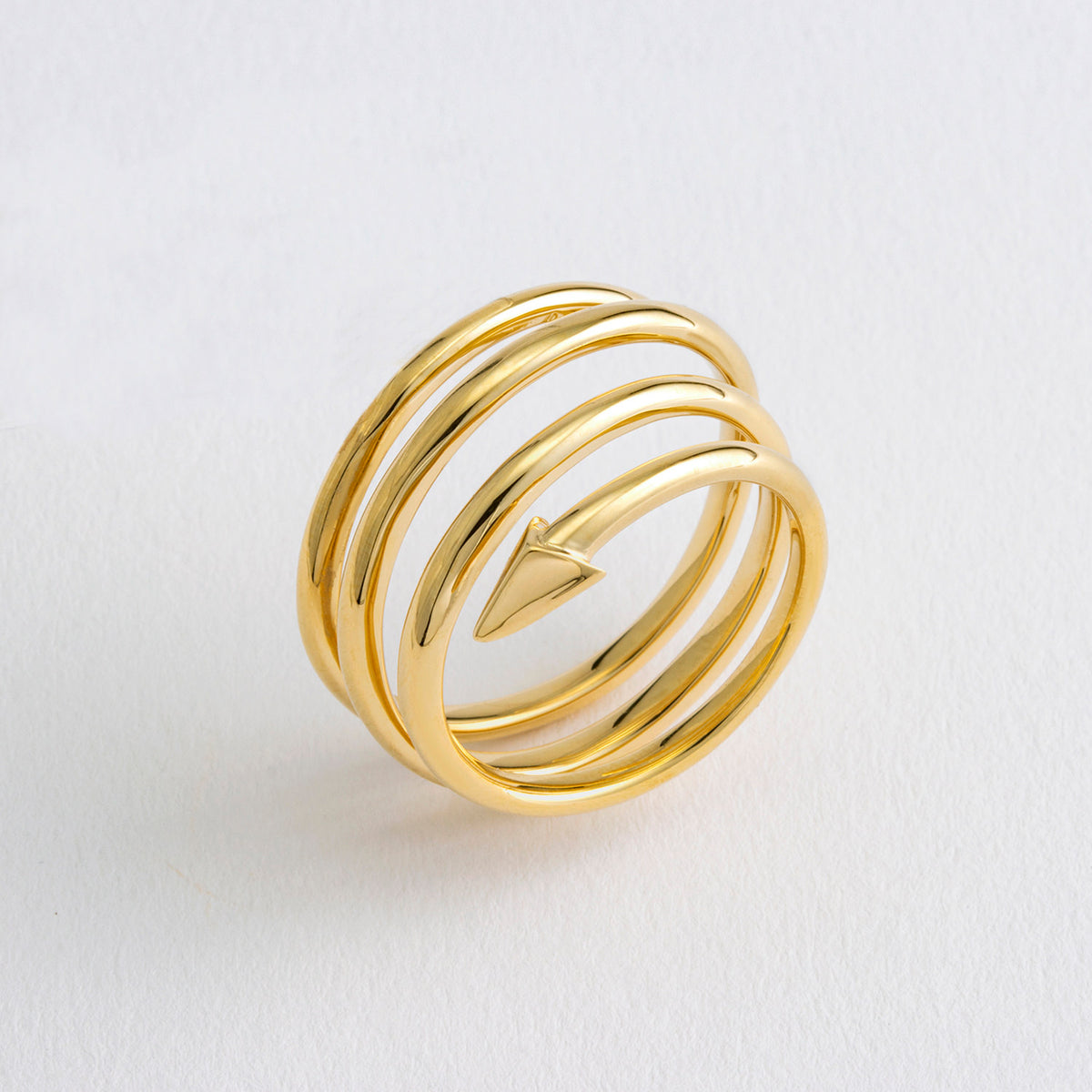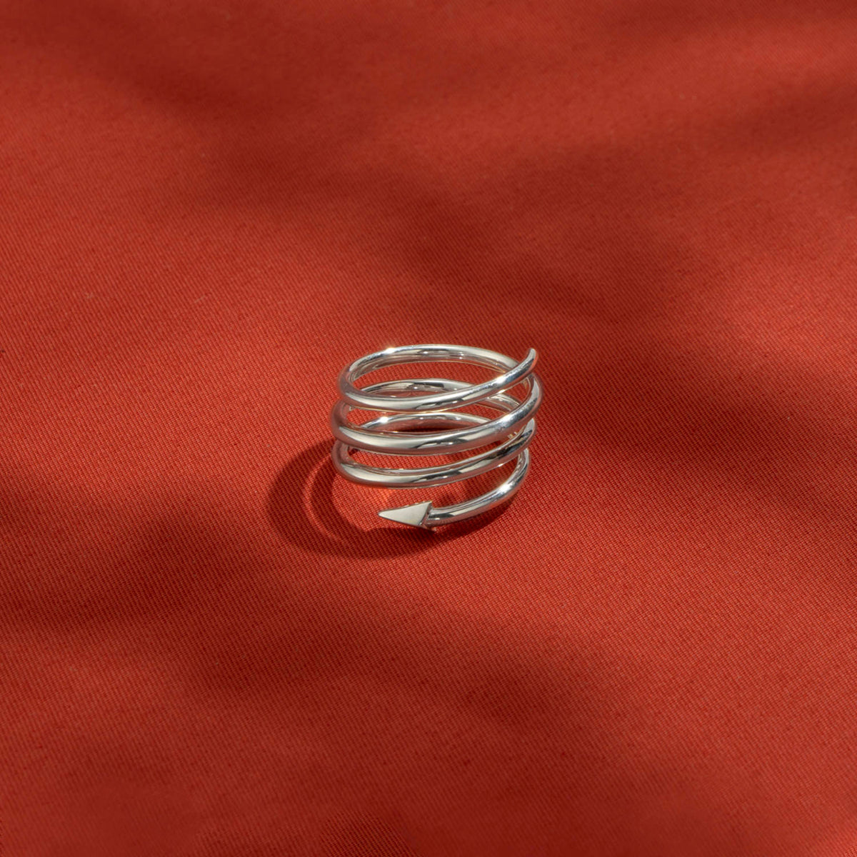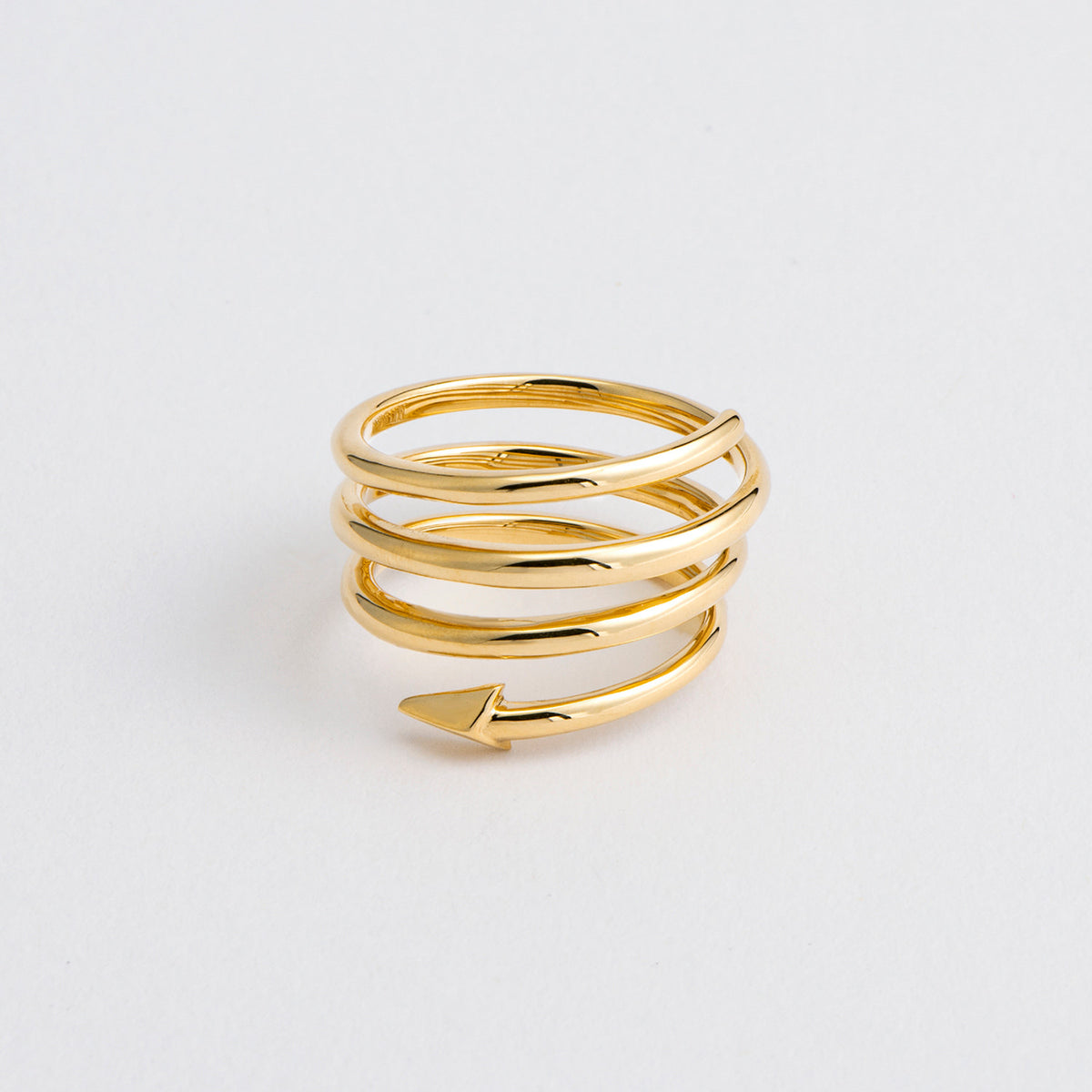さそり座の星座記号を大胆にアレンジした、アートピースのように美しいリング。指に巻きつくような螺旋のフォルムとリング先端の三角形がモダンさと力強さを感じさせます。連なった3つの輪は中心だけわずかに変化をつけ、ダイナミックな動きの中に心地よいリズム感を生み出しています。艶やかに磨き上げられた地金の輝きが指先を美しく見せてくれ、印象的で表情豊かな手元に。指に吸い付くような着け心地の良さも魅力的。