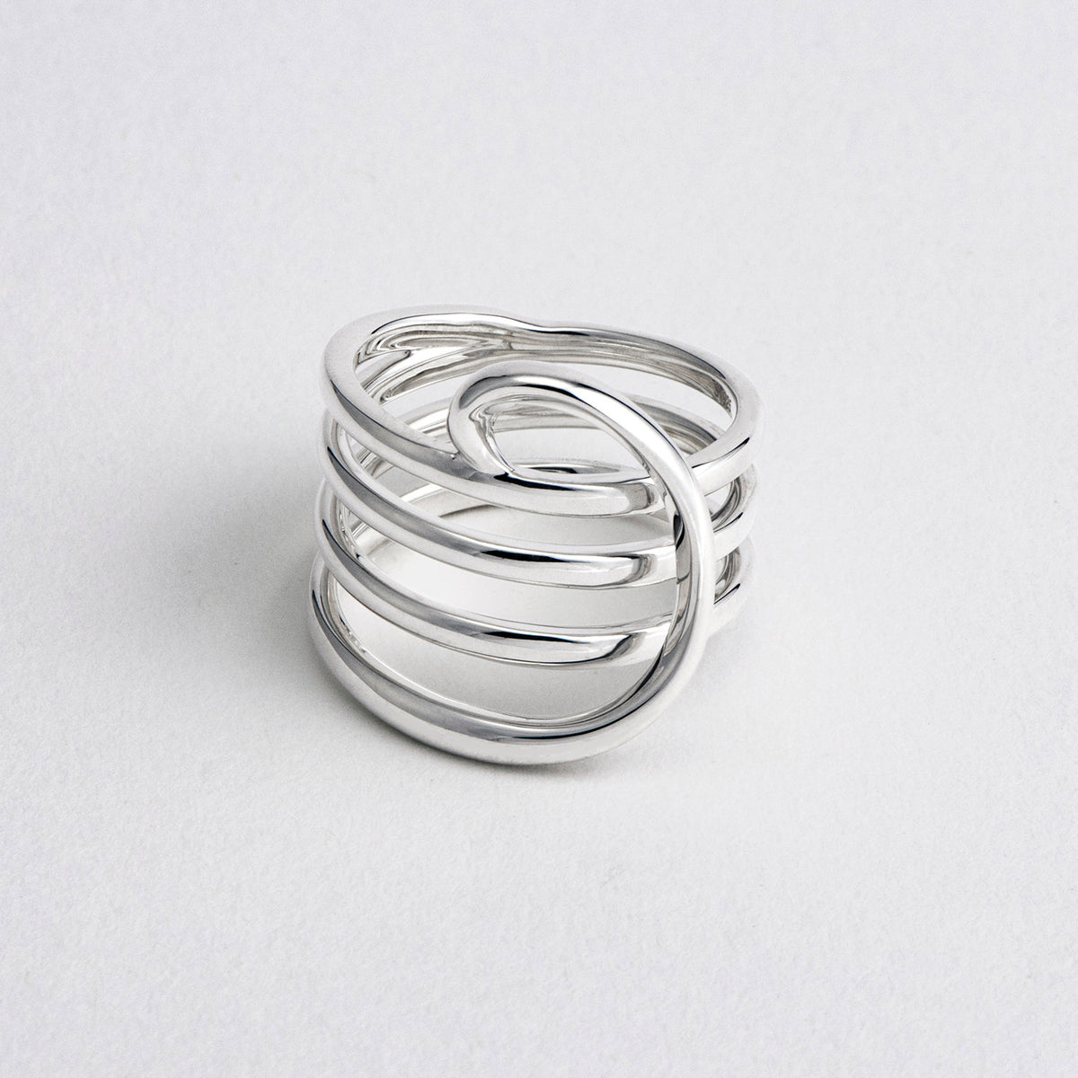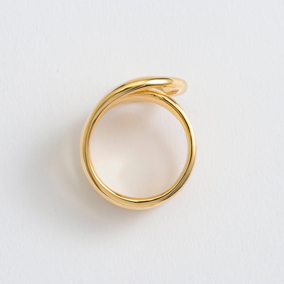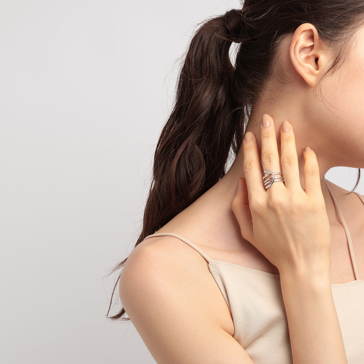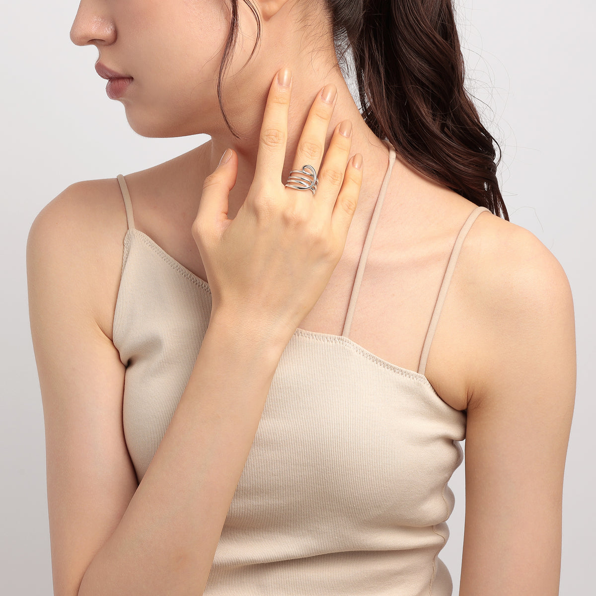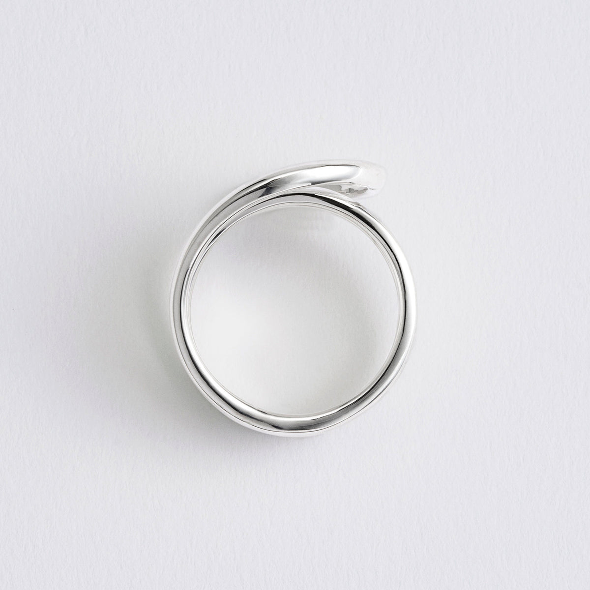 おとめ座の星座記号を大胆にアレンジした、アートピースのように美しいリング。整然と並ぶ3本のラインにひらりと重なる曲線が、しなやかで自由な表情を醸し出しています。デザインに空間を作ることでボリュームがありながらも軽やかな雰囲気に。どの角度から見ても美しい仕上がりです。艶やかに磨き上げられた地金の輝きが指先を美しく見せてくれ、印象的で表情豊かな手元に。指に吸い付くような着け心地の良さも魅力的。