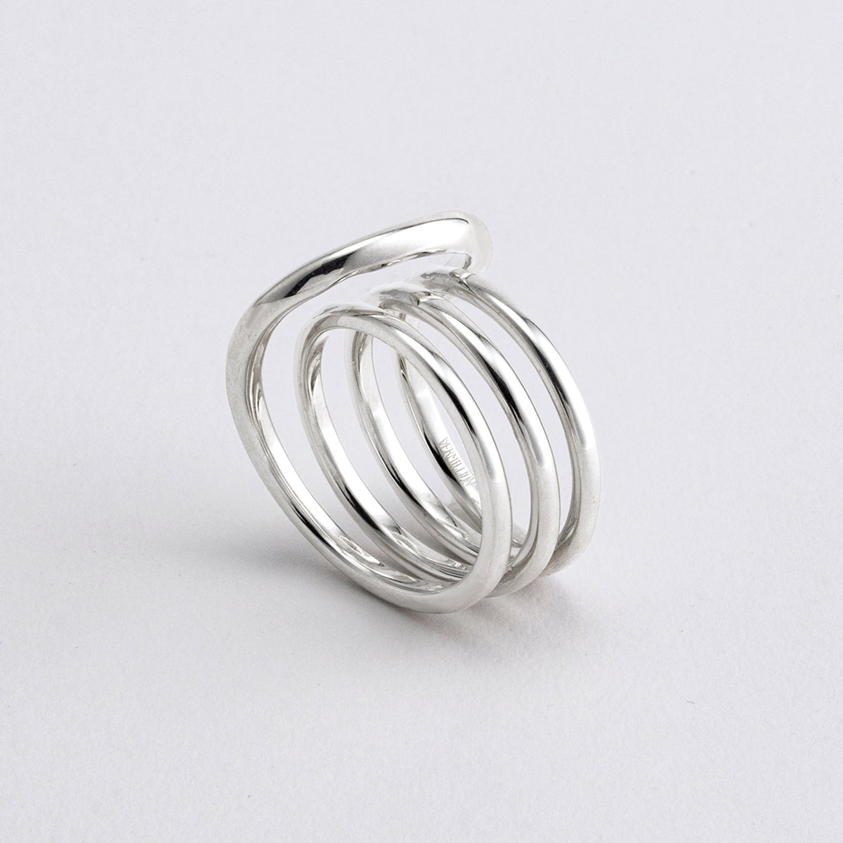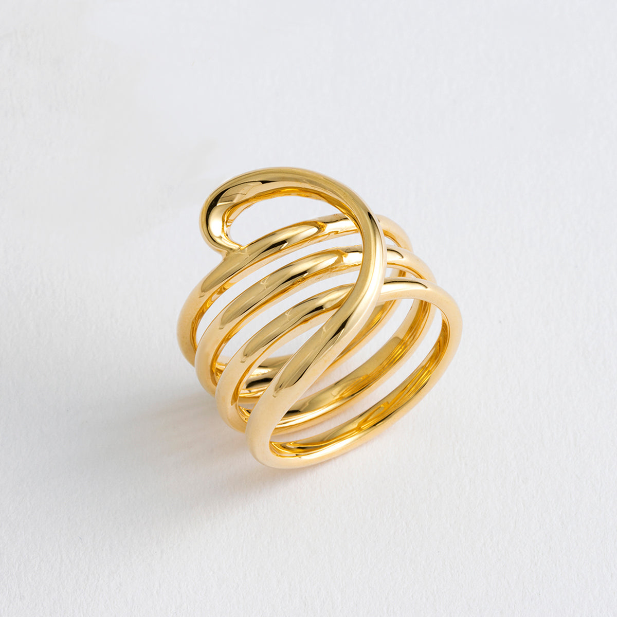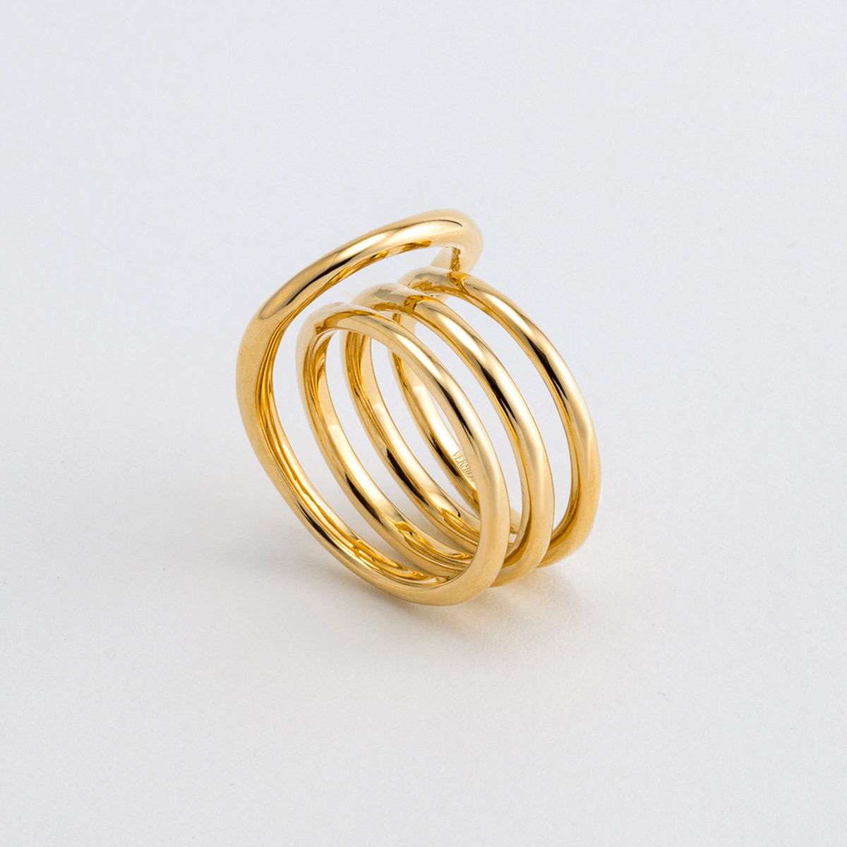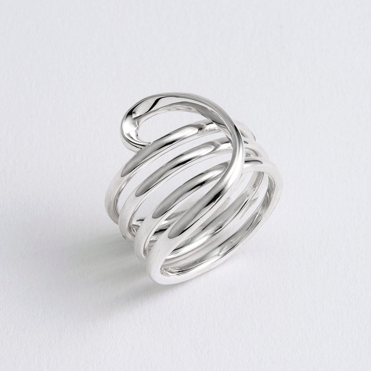 おとめ座の星座記号を大胆にアレンジした、アートピースのように美しいリング。整然と並ぶ3本のラインにひらりと重なる曲線が、しなやかで自由な表情を醸し出しています。デザインに空間を作ることでボリュームがありながらも軽やかな雰囲気に。どの角度から見ても美しい仕上がりです。艶やかに磨き上げられた地金の輝きが指先を美しく見せてくれ、印象的で表情豊かな手元に。指に吸い付くような着け心地の良さも魅力的。