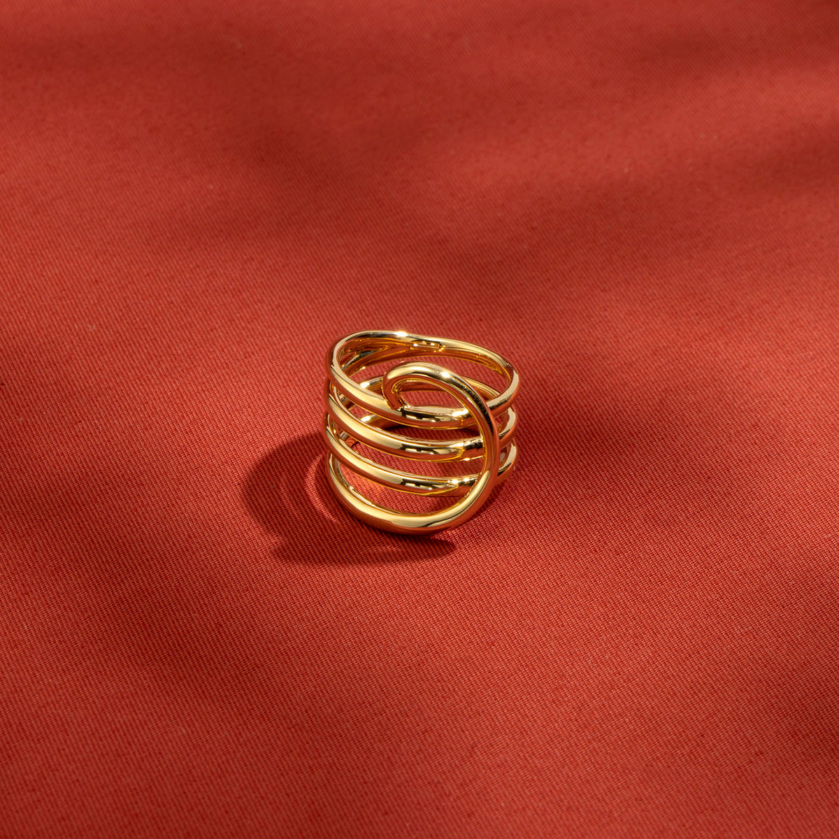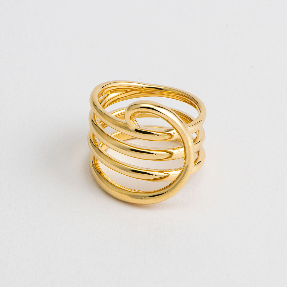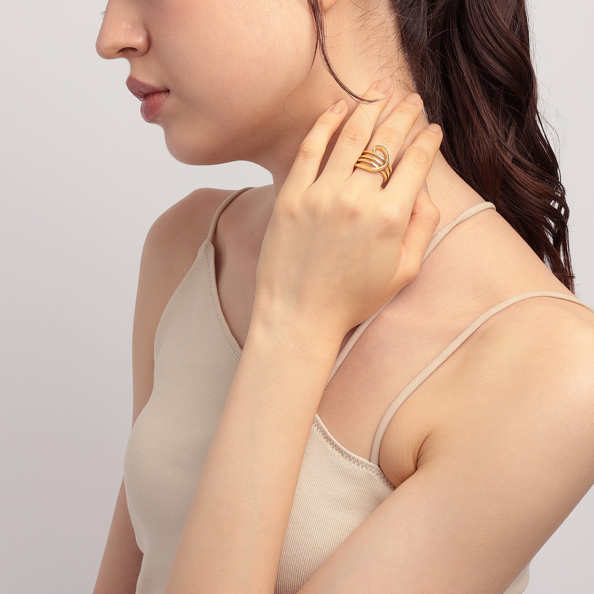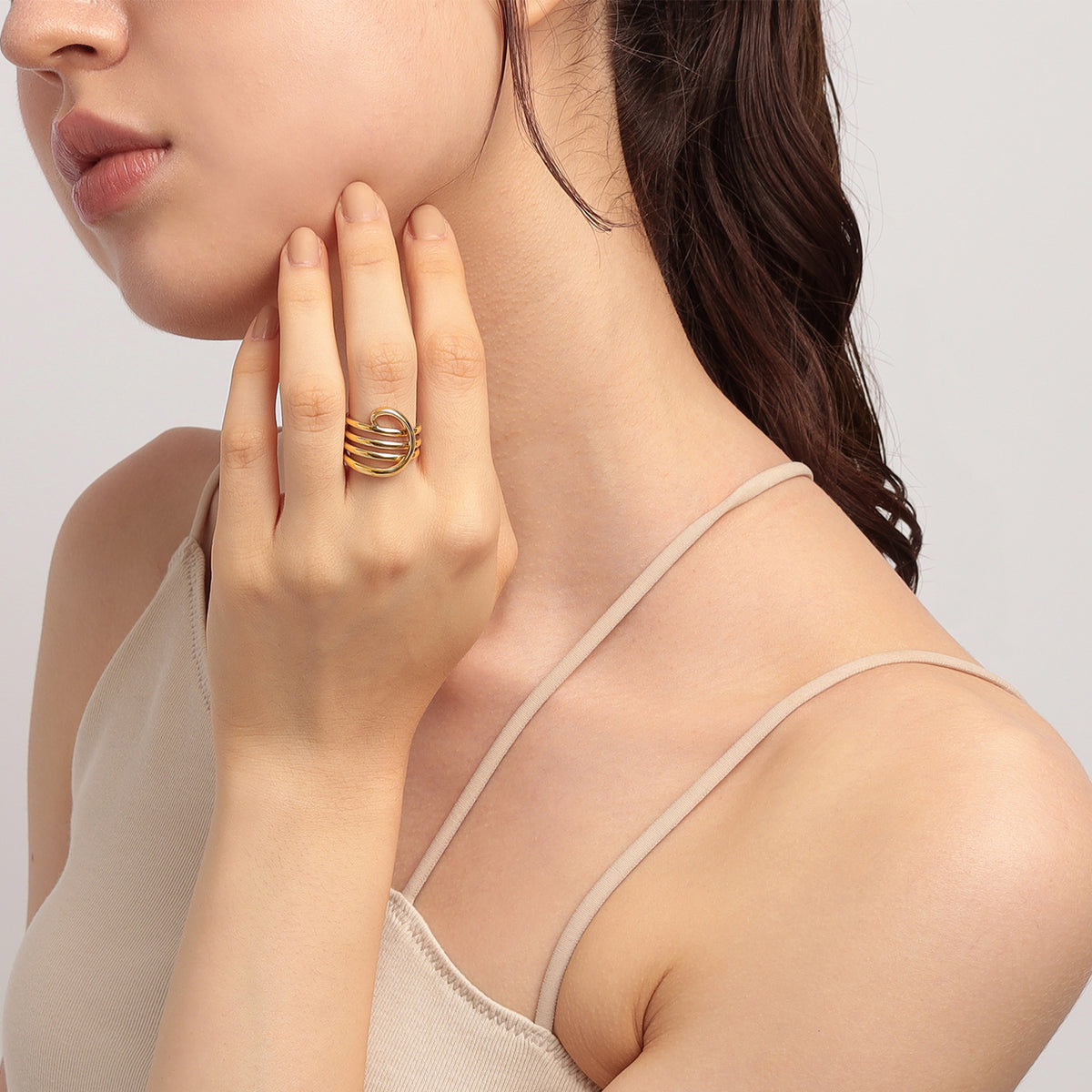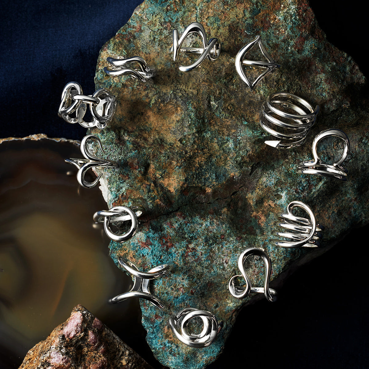 おとめ座の星座記号を大胆にアレンジした、アートピースのように美しいリング。整然と並ぶ3本のラインにひらりと重なる曲線が、しなやかで自由な表情を醸し出しています。デザインに空間を作ることでボリュームがありながらも軽やかな雰囲気に。どの角度から見ても美しい仕上がりです。艶やかに磨き上げられた地金の輝きが指先を美しく見せてくれ、印象的で表情豊かな手元に。指に吸い付くような着け心地の良さも魅力的。